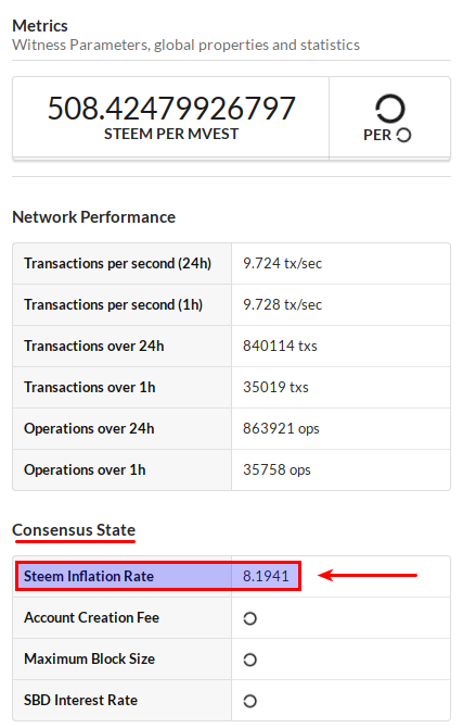 Inflaciju možemo naći u svakom trenutku na SteemDB.com u desnom bloku: "Consensus State"