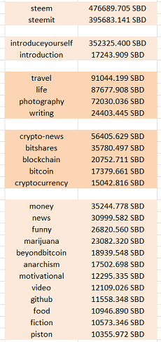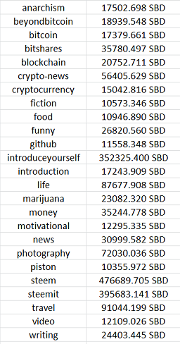 So you just go on page https://steemit.com/tags.html/trending and at this moment find the most popular. For example more than 10000 SBD: