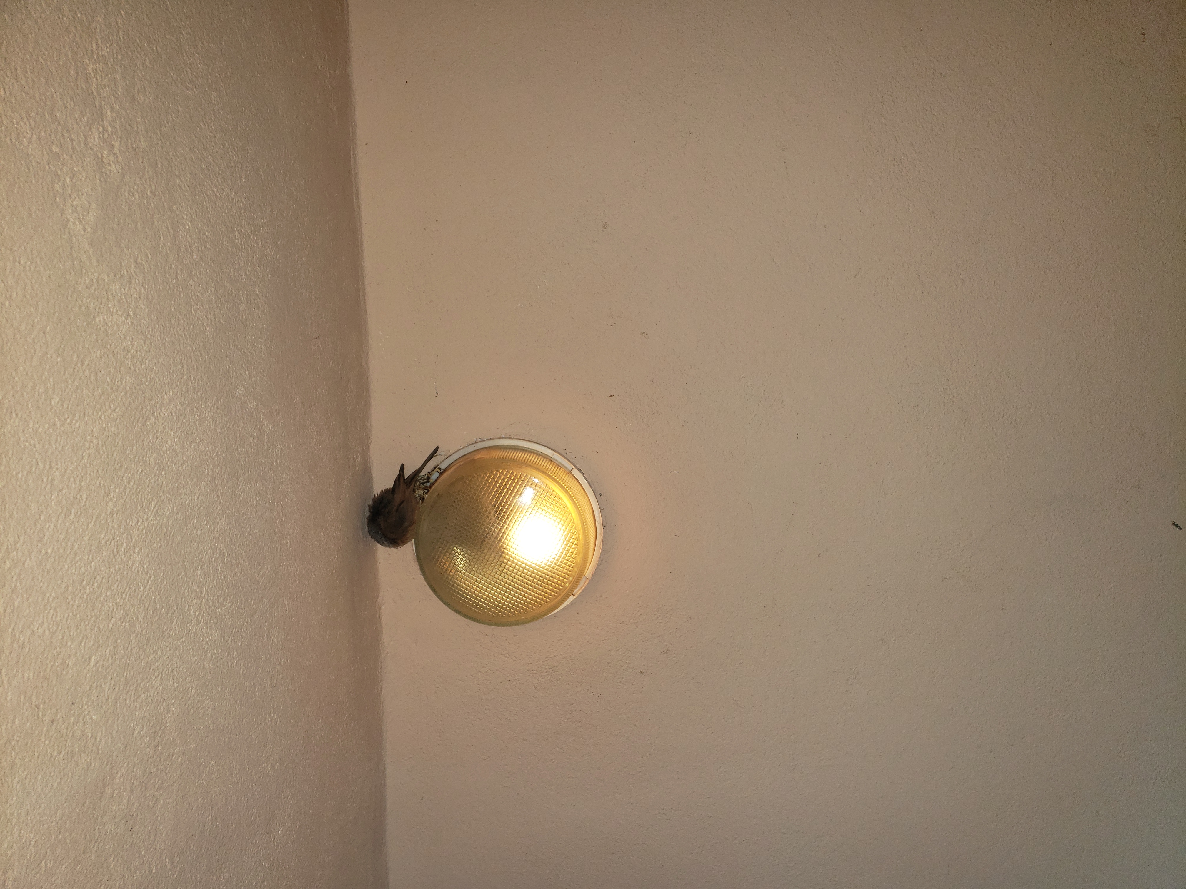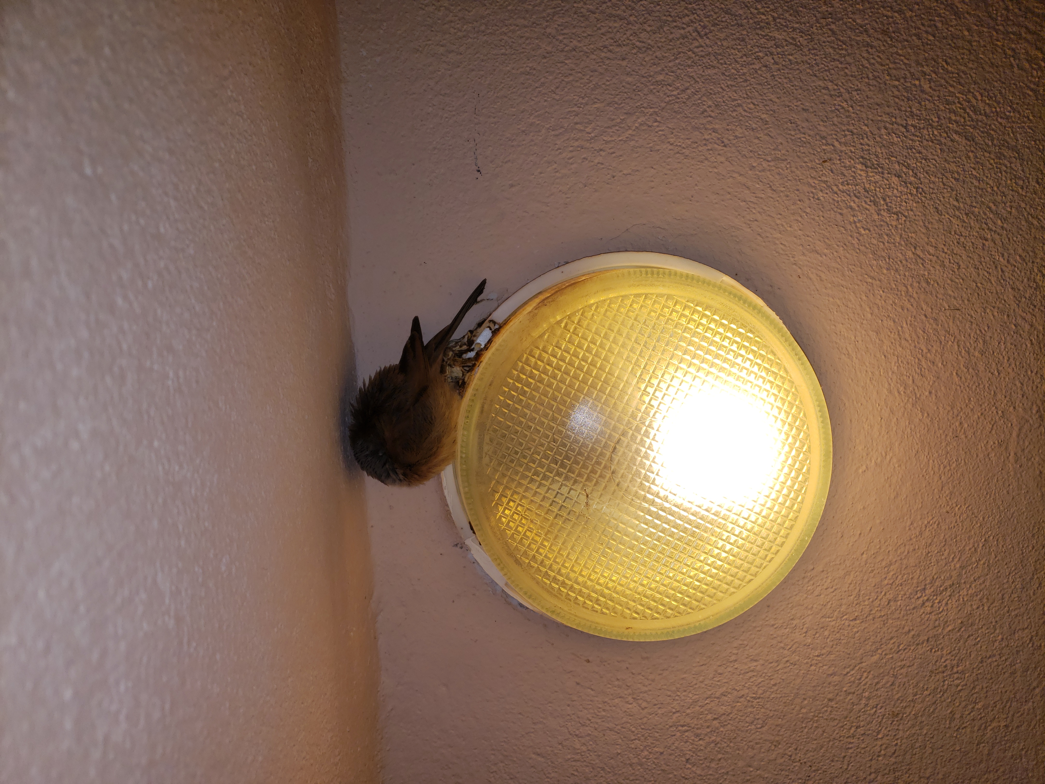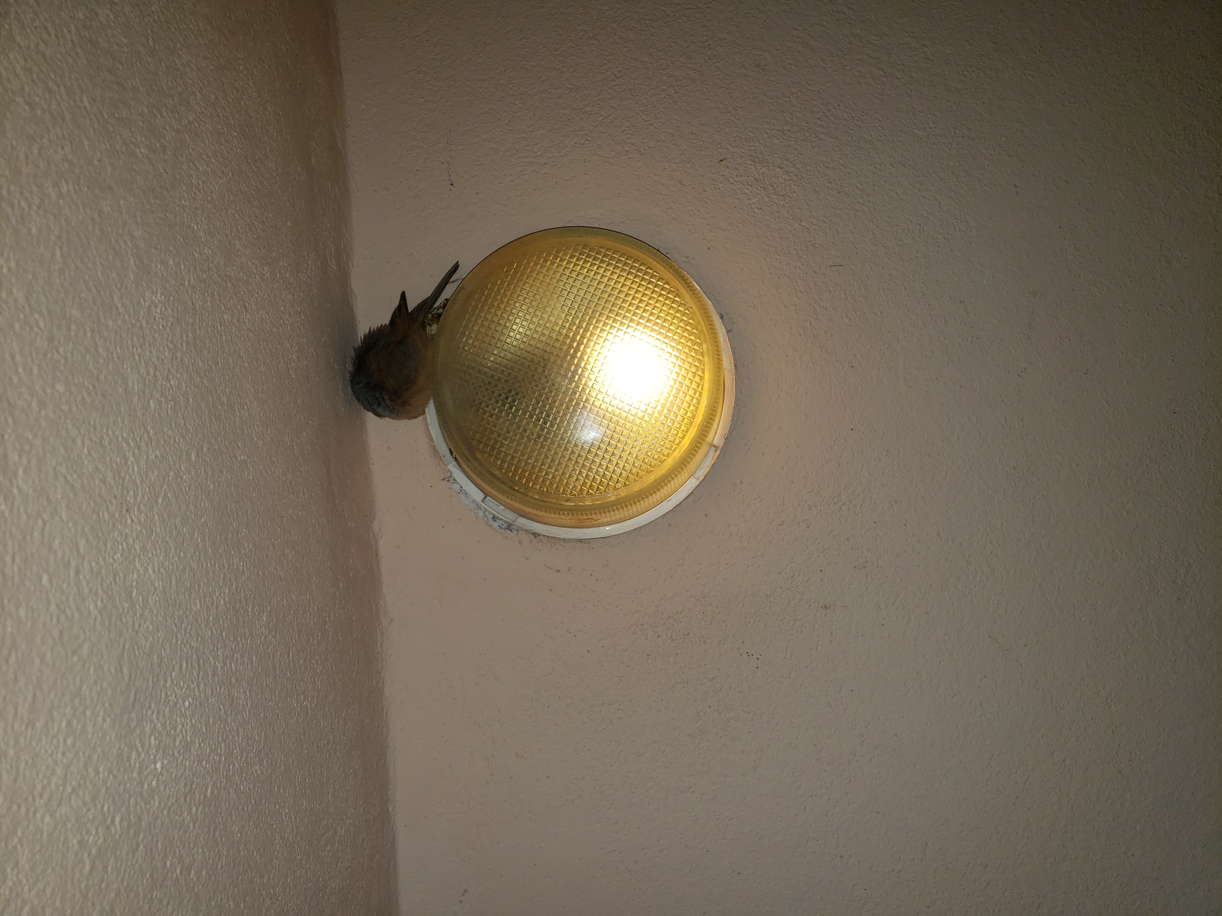 The reason it moved from its original spot was that some cats were born in my grandfather’s house. Their mother gave birth there, and my grandfather let them stay. The kittens often climb up, play, and move around, which frightened the bird, so it decided to move closer to the lamp for safety.