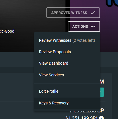 Puedes acceder a las herramientas de recuperación de cuenta yendo a tu perfil y haciendo clic en "acciones" en el encabezado :