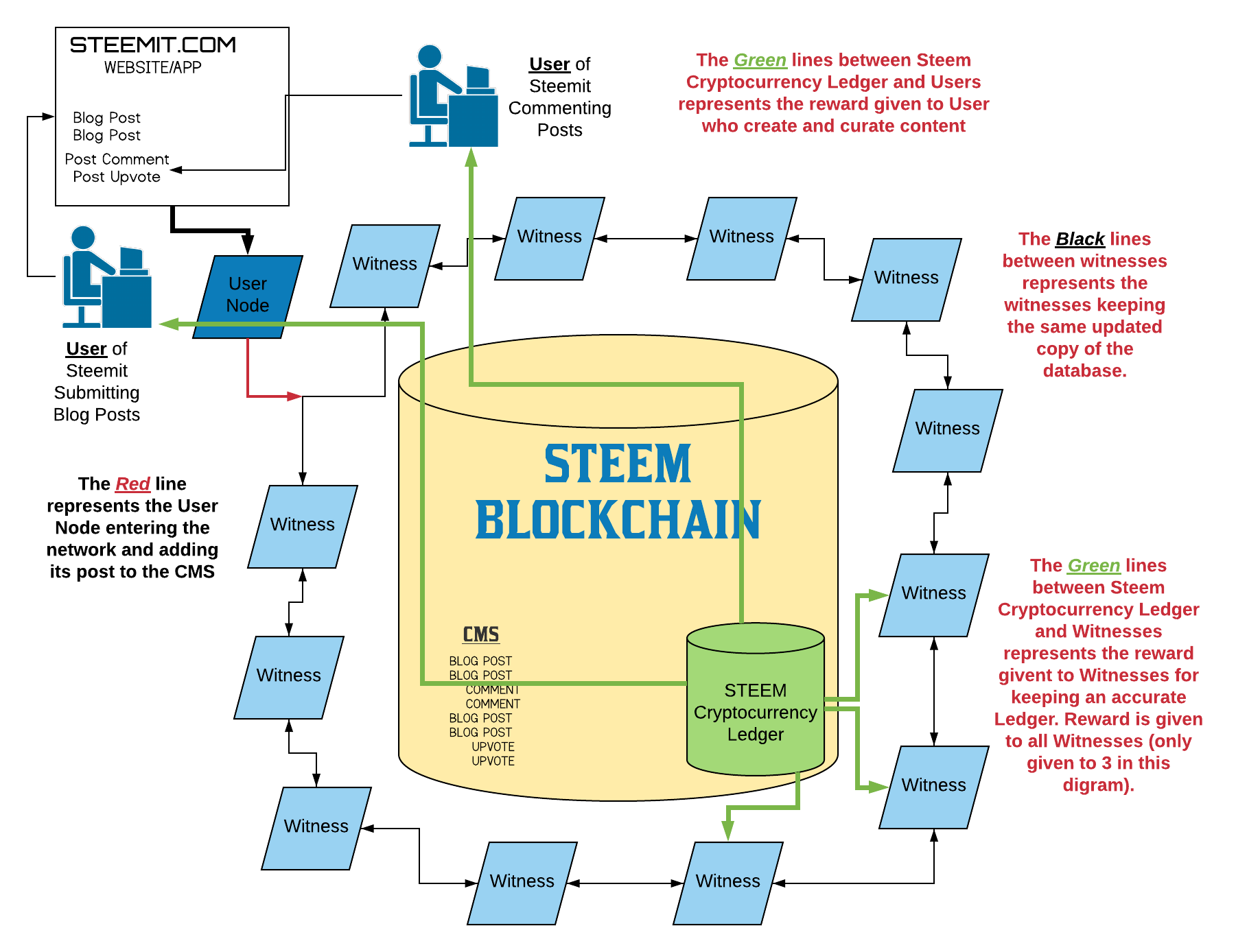 What makes Steem different is that the backend has a host of specialized instruments needed to make these transactions possible, things that really have never existed in any other paradigm before. The most important thing about the Steem platform is that the database needs to be almost completely censorship resistant, otherwise, the cryptocurrency is just not possible (it wouldn’t hold any value). In order to make the cryptocurrency aspect possible within the database, there needs to be redundancy, meaning you can’t have only a couple of nodes that control the network. The way the Steem blockchain handles the issue of redundancy is by utilizing a series of nodes (or computers). These nodes are operated by a selected and elected group of people. The nodes all communicate with each other in set algorithmic ways in order to make sure that all the nodes on the network are running the same version of the database. If any node is NOT running the correct copy of the database, they are kicked out of the network. Nodes don’t want to get kicked out, there is an incentive to stay in the network where they are rewarded with the cryptocurrency Steem for their honest participation. The Blockchain is programmed to pay the participating nodes each time they successfully keep track of the ledger, so they don’t want to get kicked out (it would be the equivalent of a human losing their job or getting fired). The Steem blockchain is a system of incentives that propagates the network making the cryptocurrency possible, Steem is the first blockchain to make cryptocurrency available in this specific way. This particular consensus algorithm is known as DPOS or Delegated Proof of Stake.