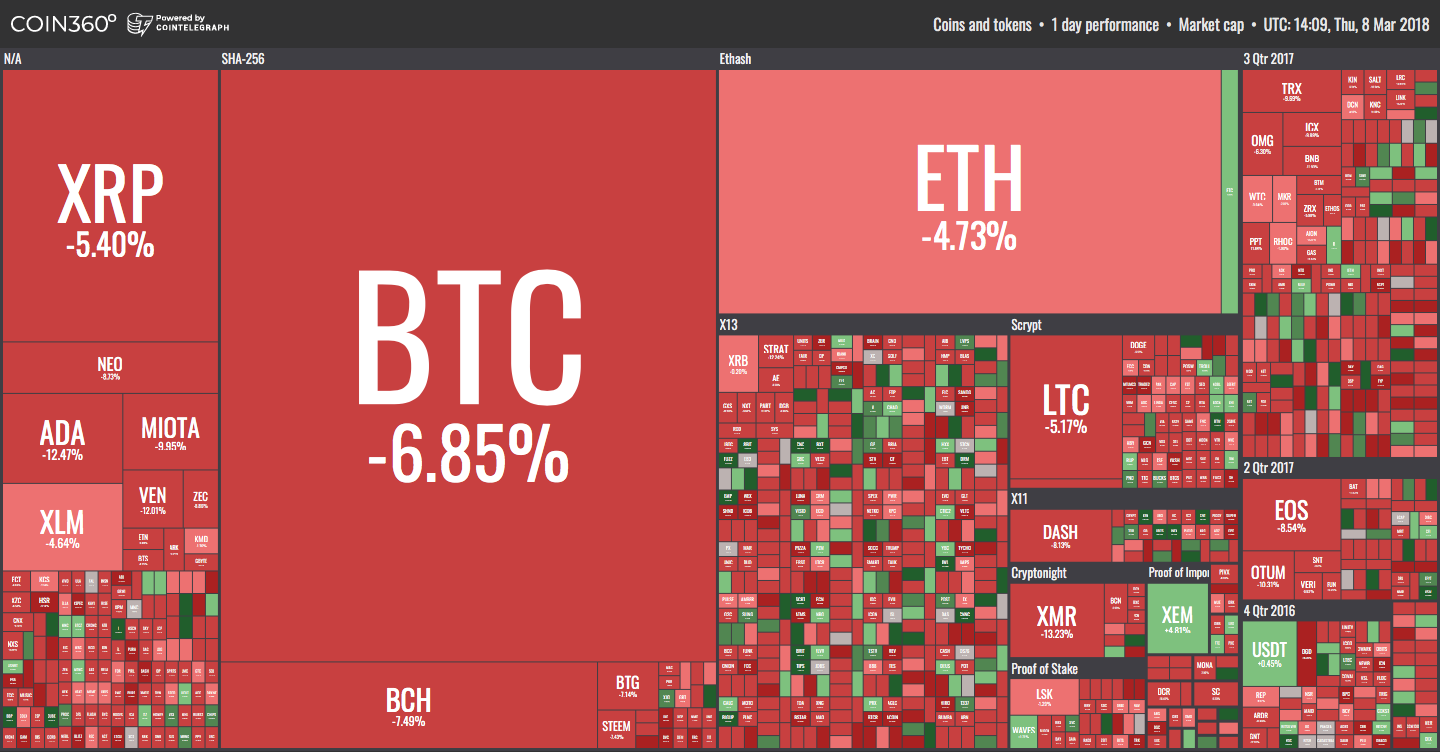Looking at assets tracked by Coin360, some remained stable (Ethereum Classic), some dropped less than BTC against the dollar (Ethereum, Ripple) while others posted bigger losses (Dash, Cardano, Monero).