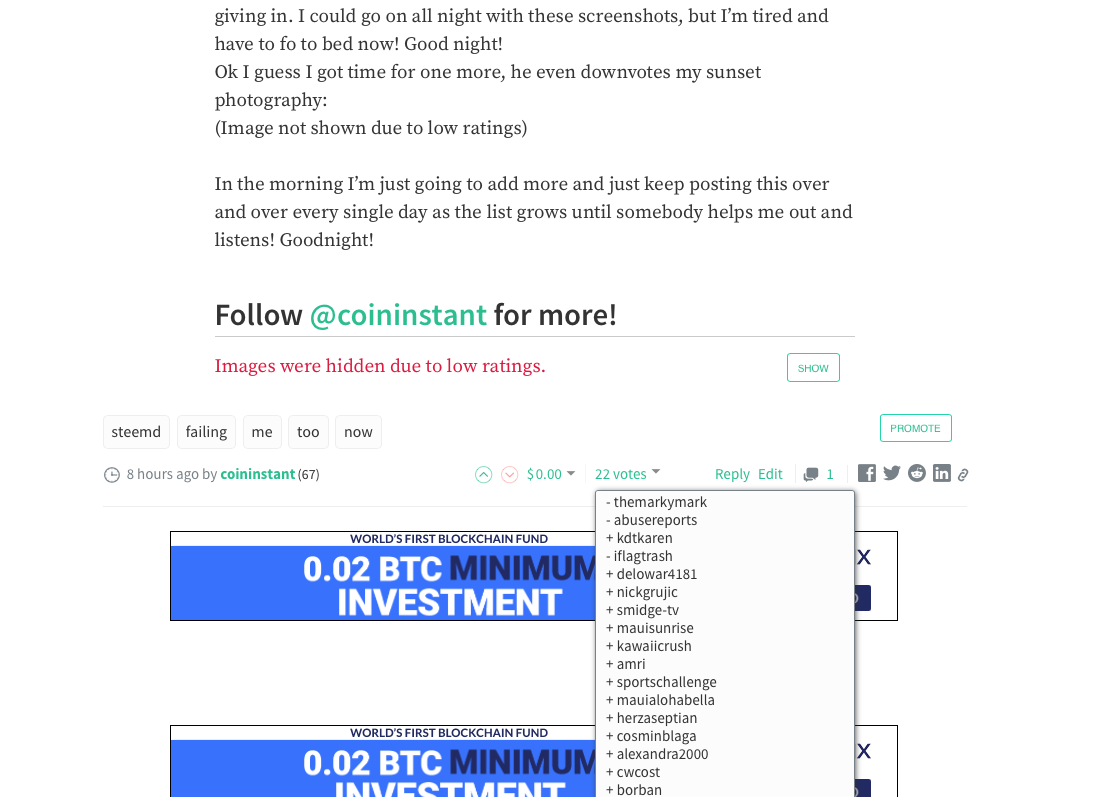 Ok u just made an enemy of @coininstant! Don’t be defending these guys. I’ve been here since the beginning. These guys targeted me for simply writing a post about flagging bidbots. I don’t know where u get off tying to call me worse than bernie now, but I like it! lol I’m just a nice guy trying to figure my way out if this mess! I upvote tons of people that are cool, almost 75000 upvotes and counting!