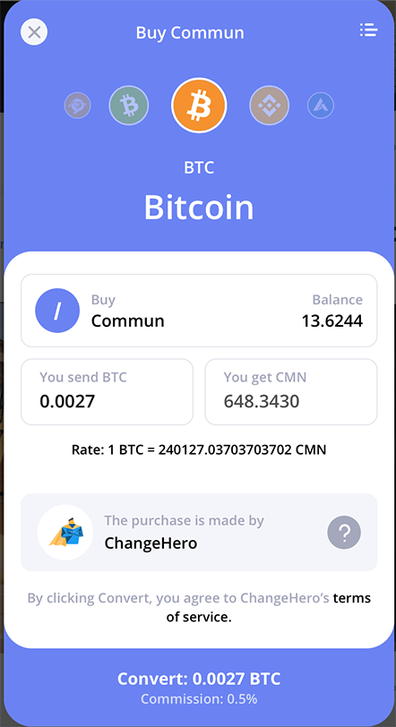 At Commun we’ve added a new very important feature recently. Namely, the “Buy” button that allows you to acquire Commun tokens using BTC.