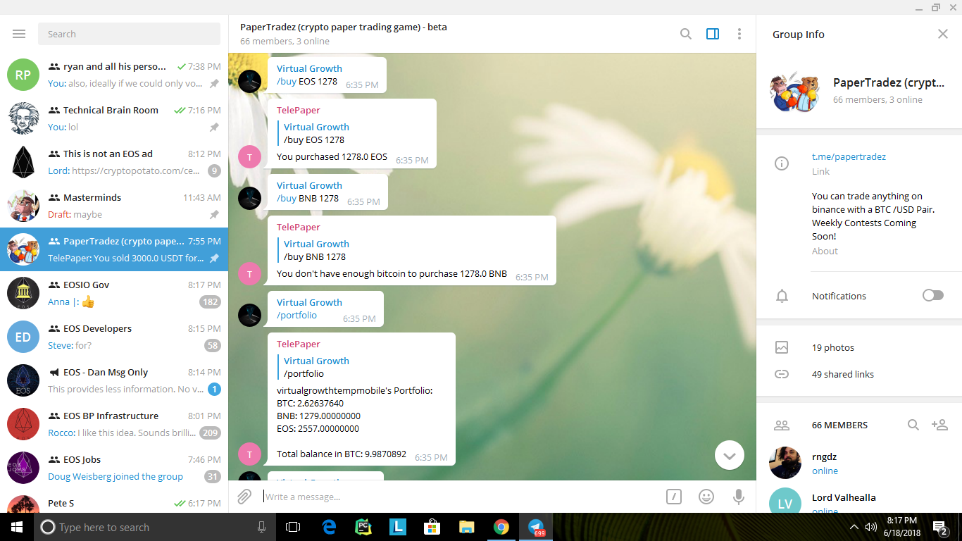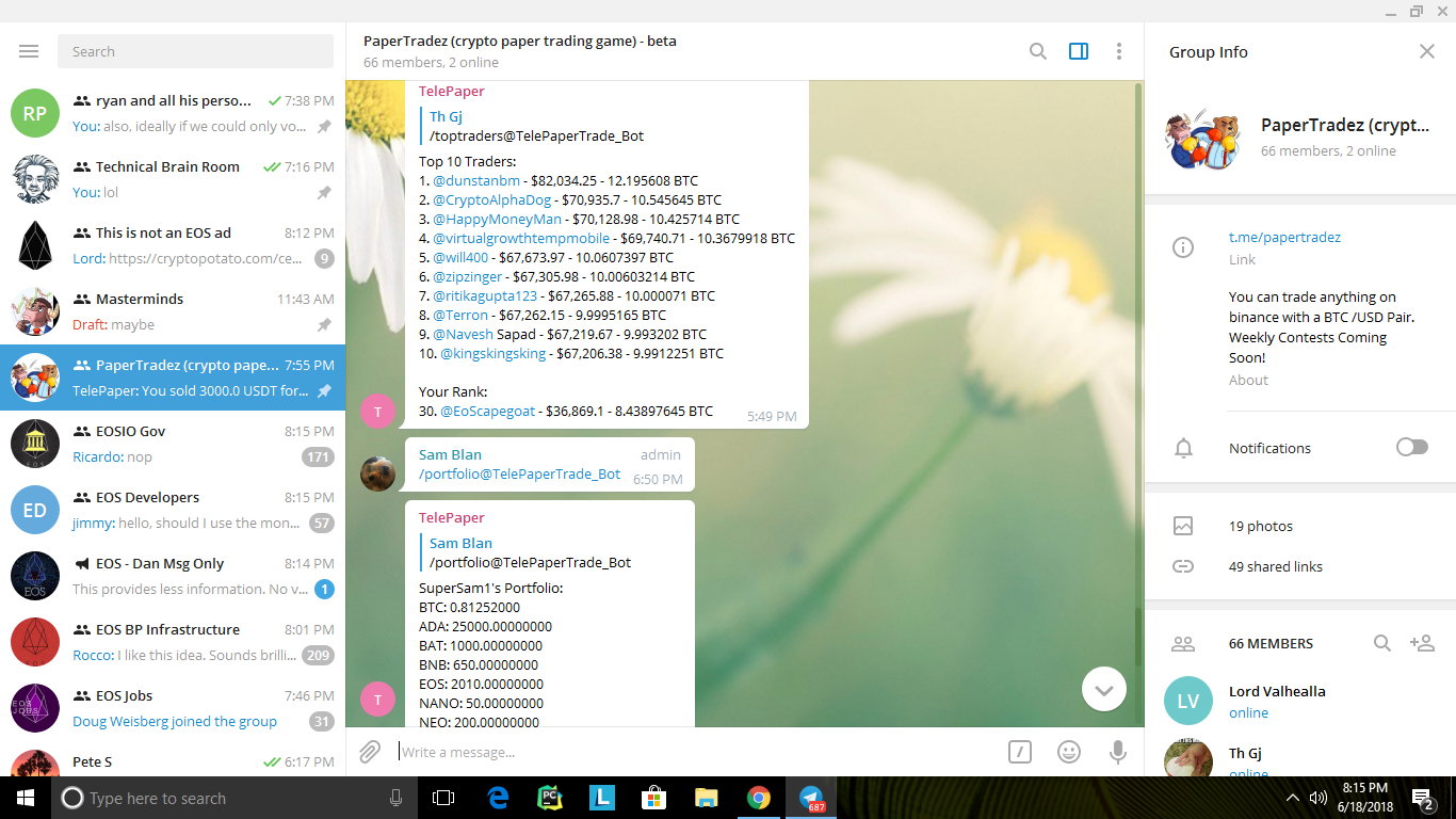Come check out our fun telegram game, where you can trade a "paper"(fake money) crypto portfolio. The game is still in beta but soon we will be paying out steem prizes to the top traders.