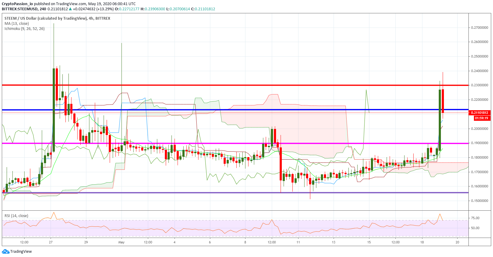 I was saying you in my last analysis that we must take some distance from the red cloud and go test the resistance line at 0.19$. It is now done and as predicted also that break created a nuce UP move and perhaps the start of an UP trend on the STEEM. Let's wait and see where this UP will stop...