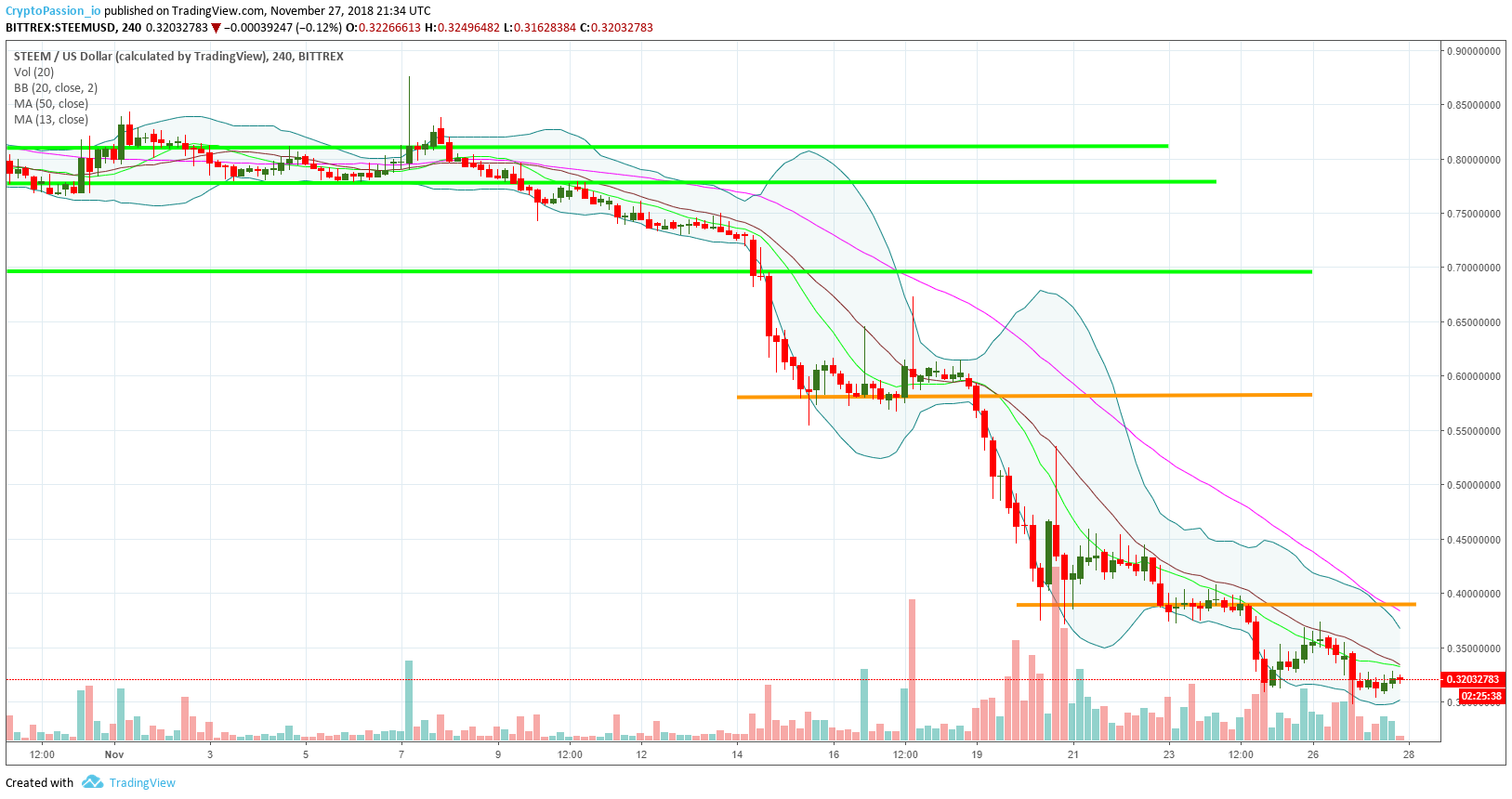 The STEEM is still doing lower lows and lower highs. We broke the previous low, slightly but we broke it and we have now to see if the next high will be lower than the previous high also. The ideal scenario would be that we go test the orange line that I traced to you. It would be a nice indicator that the short term low is done. Let's see what we will do this monday.