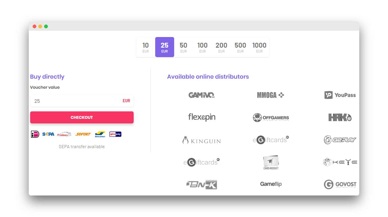 Together with our distributors, we have a huge choice of payment methods. You can buy our voucher online worldwide. When it comes to offline offering, we are now in a few countries like Canada, Australia, and the US. You can check the full list on our map.