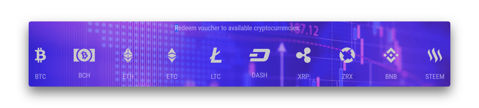 Crypto Voucher offers various cryptocurrencies to choose from at the best rate. You can instantly buy Bitcoin, Ethereum, Ripple, Bitcoin Cash, Litecoin, Ethereum Classic, 0x, BNB, Steem or Dash.