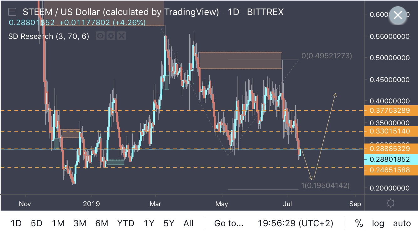 Steem seems to be continuing it’s way down on the daily chart after breaking a flag pattern and is now heading for the most likely turning point around $0.20 where an AB=CD pattern would complete and a major support level is located. This would be the best price to buy from a long term perspective.