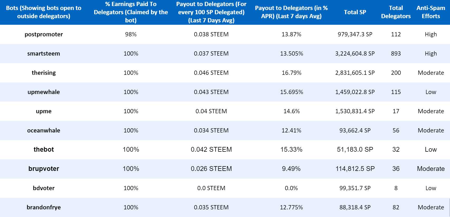 Let's compare returns from delegating to bots vs. delegating via the Delegationhub platform. The best paying bot right now is "therising" with 16.42% APR as you can see in the table below.