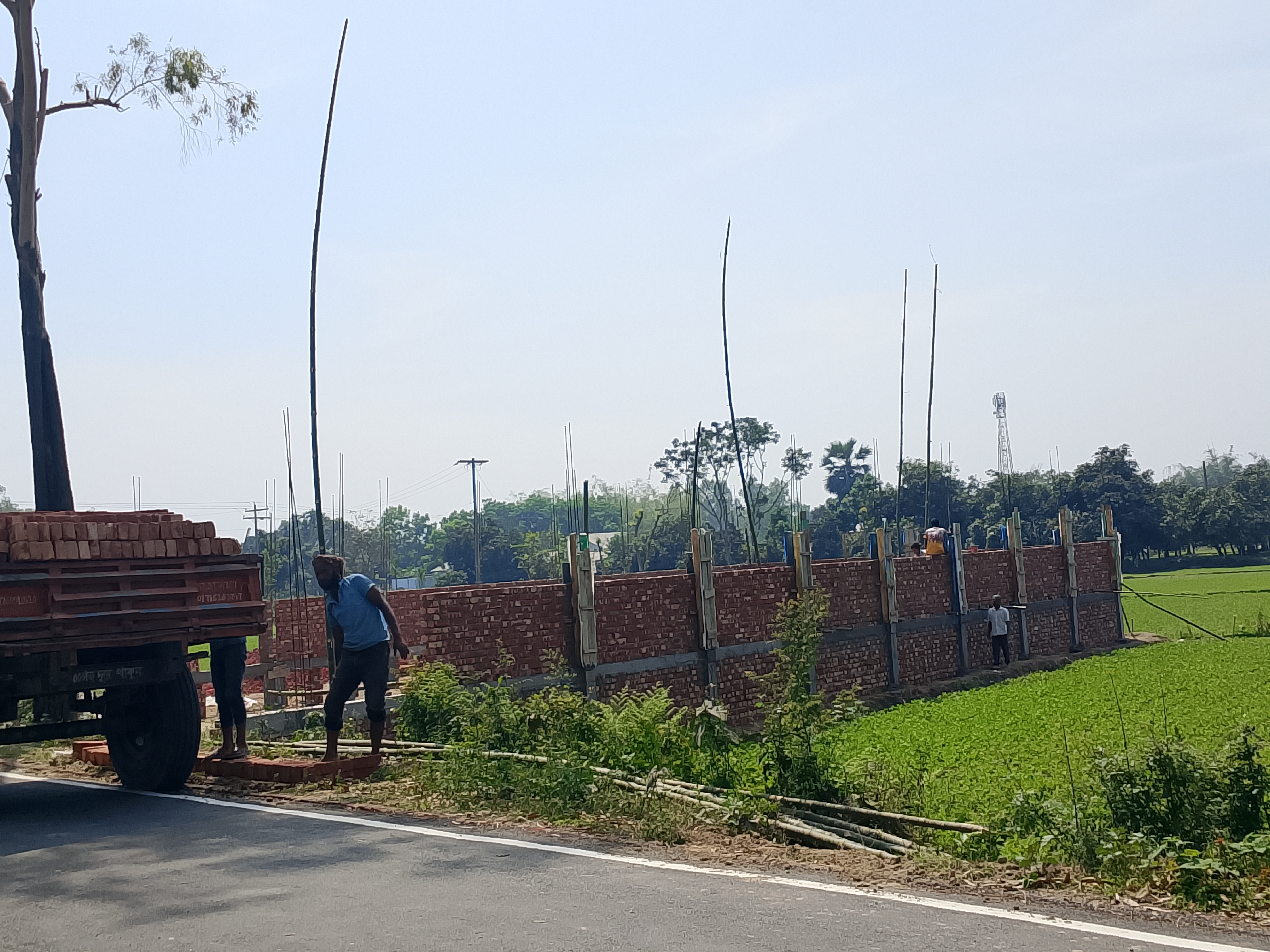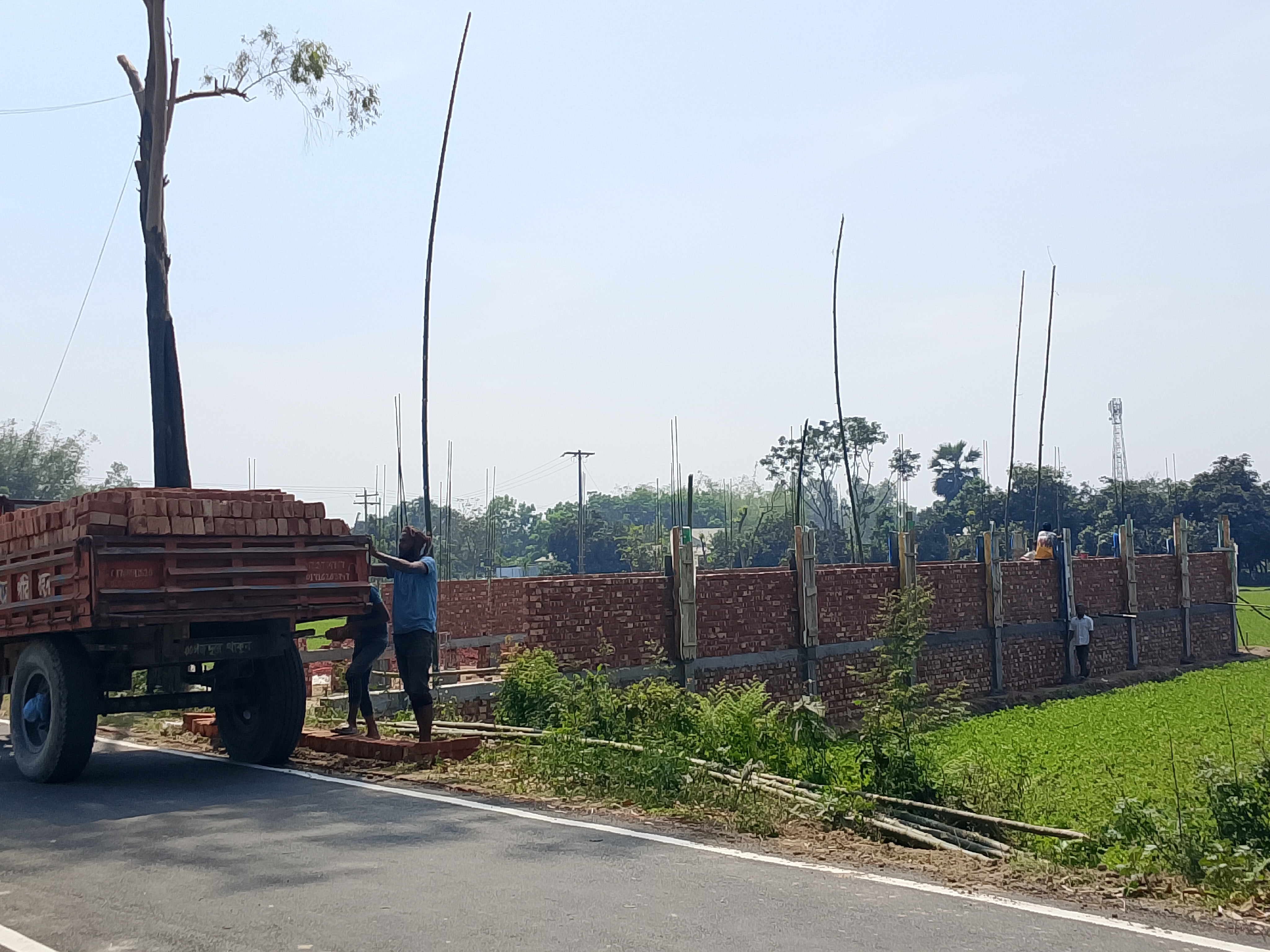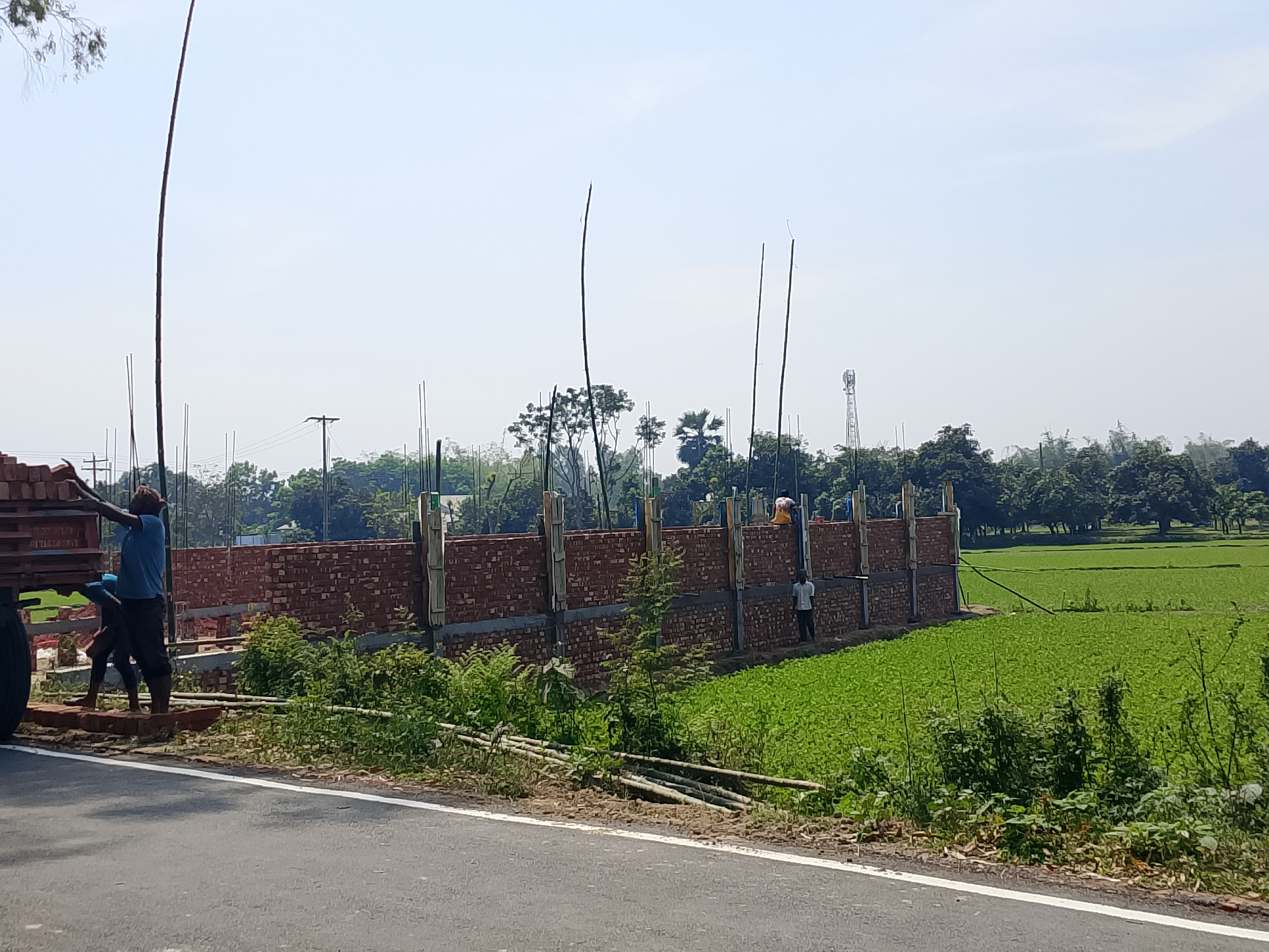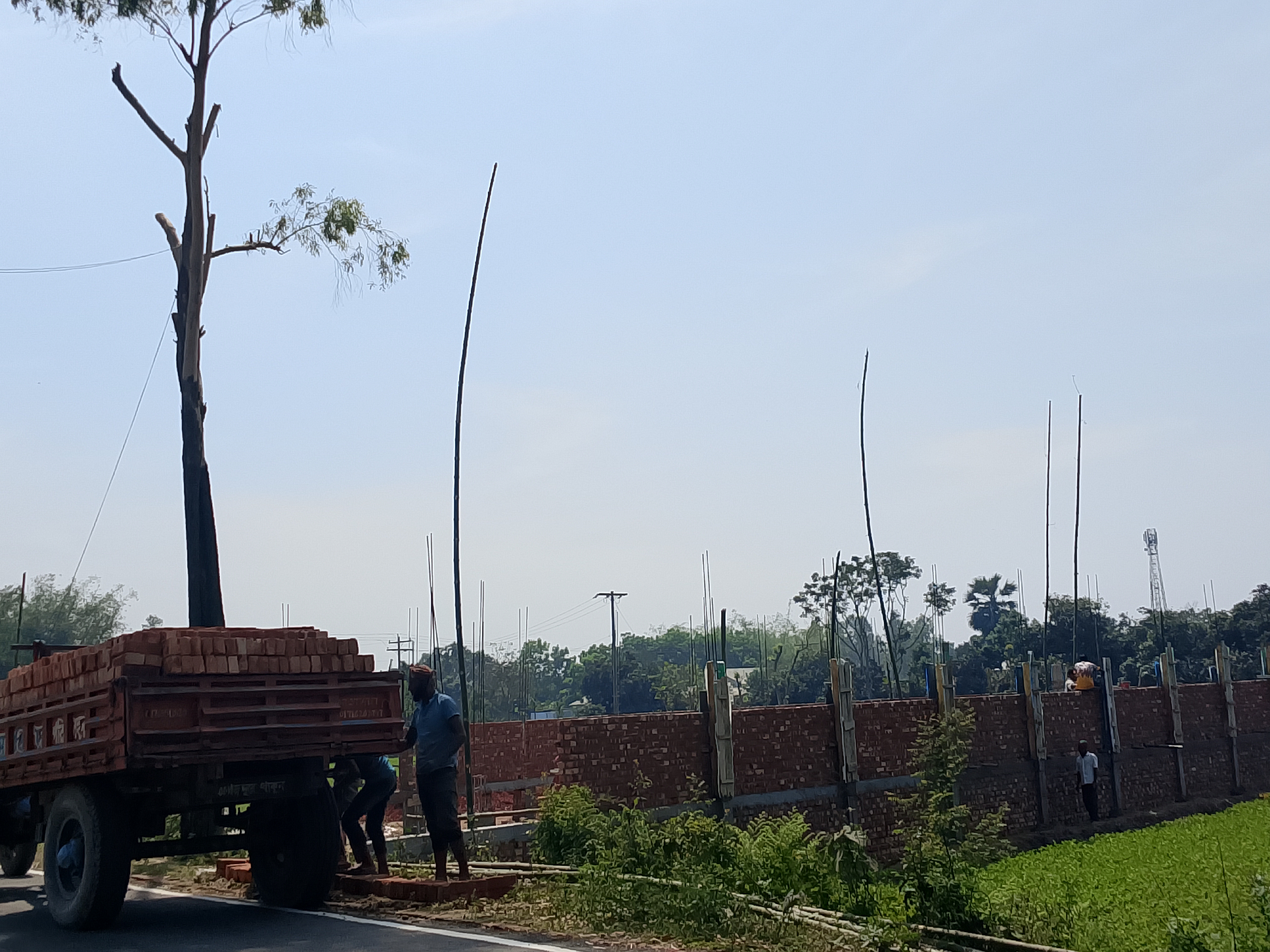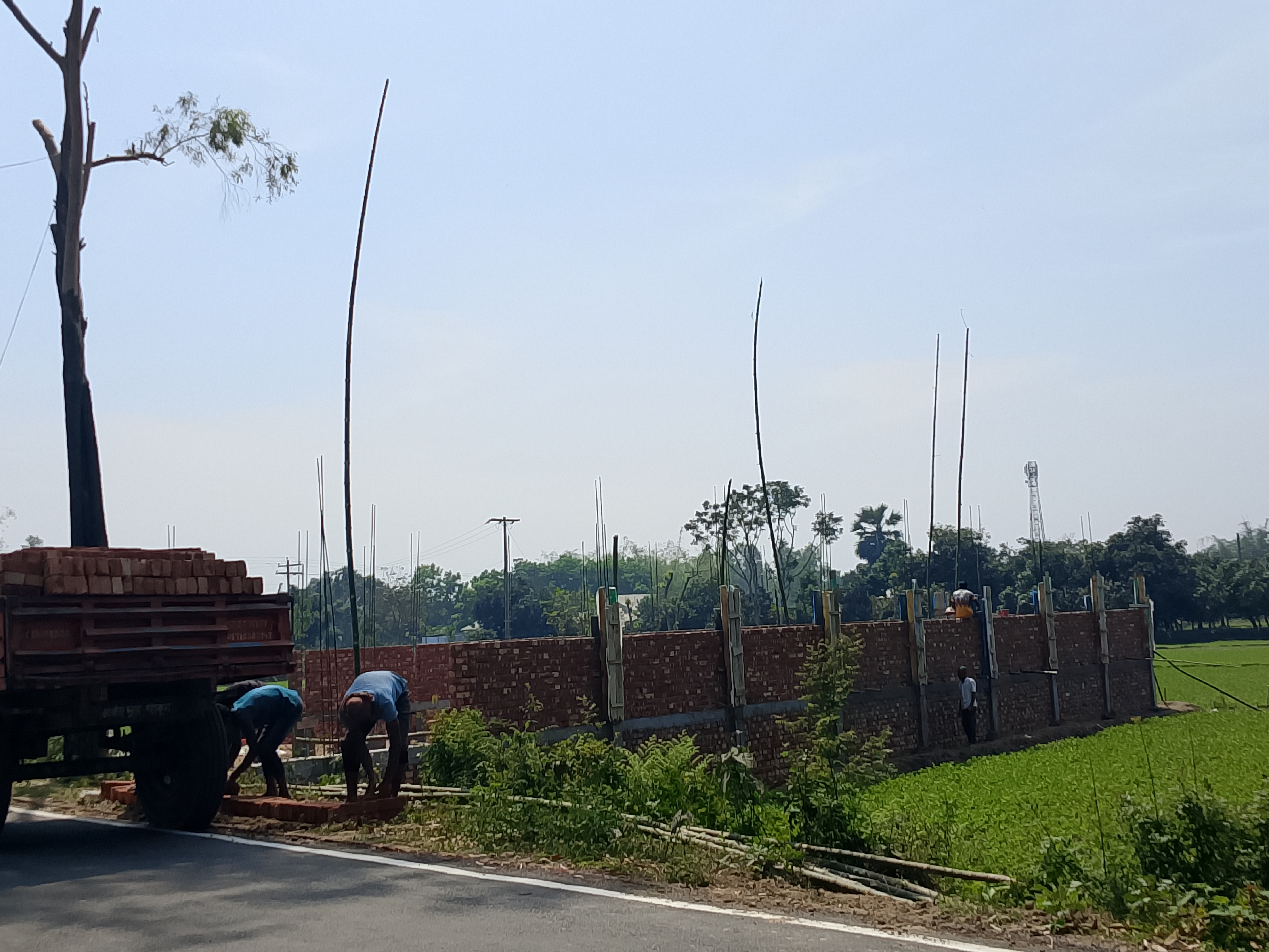 A new large warehouse is being constructed beside the road and in the middle of a piece of land. It is being built for a business, and the work is progressing quickly. Walls are being raised on all sides. After the old structure is removed, business activities will be carried out here, which is why this warehouse is being built.