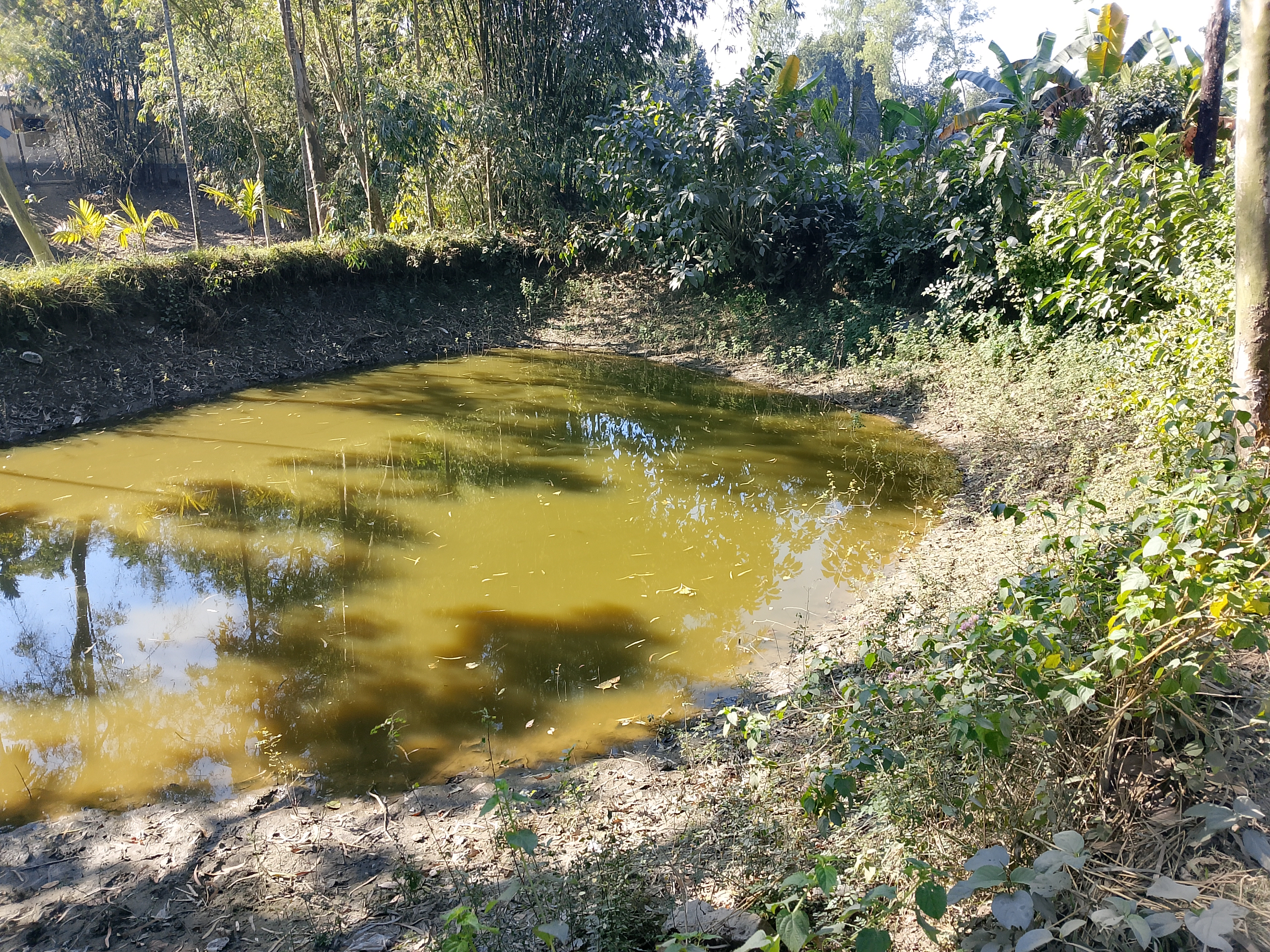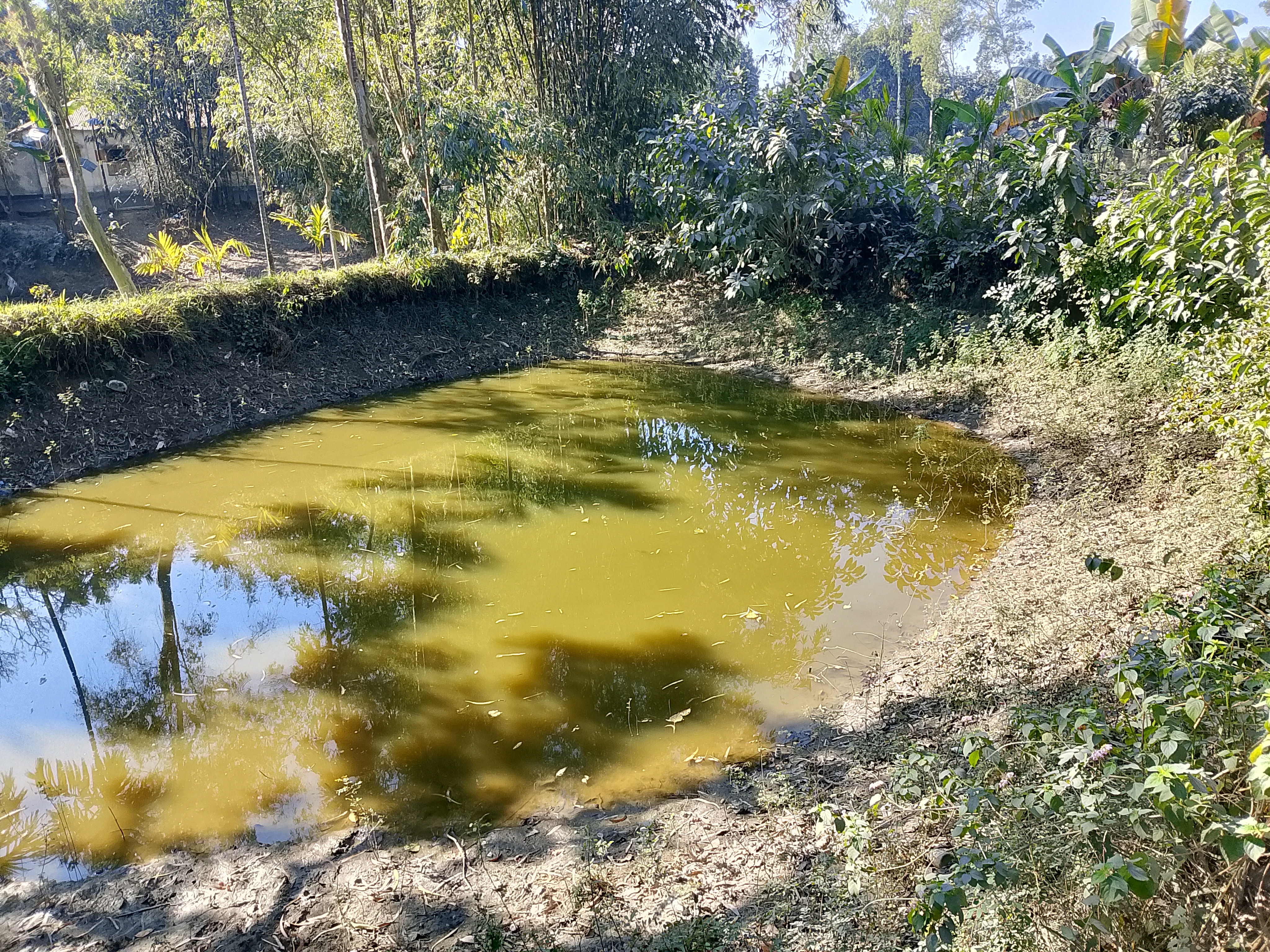 In a small pond, the water has dried up. Some fish had been farmed there, but the water in the pond is slowly drying out. When the rainy season comes, the pond will fill with water again, and then it will be more convenient for fish farming. Because this pond is very shallow, the water does not stay for many days. Ponds that are shallow like this cannot hold water for long.