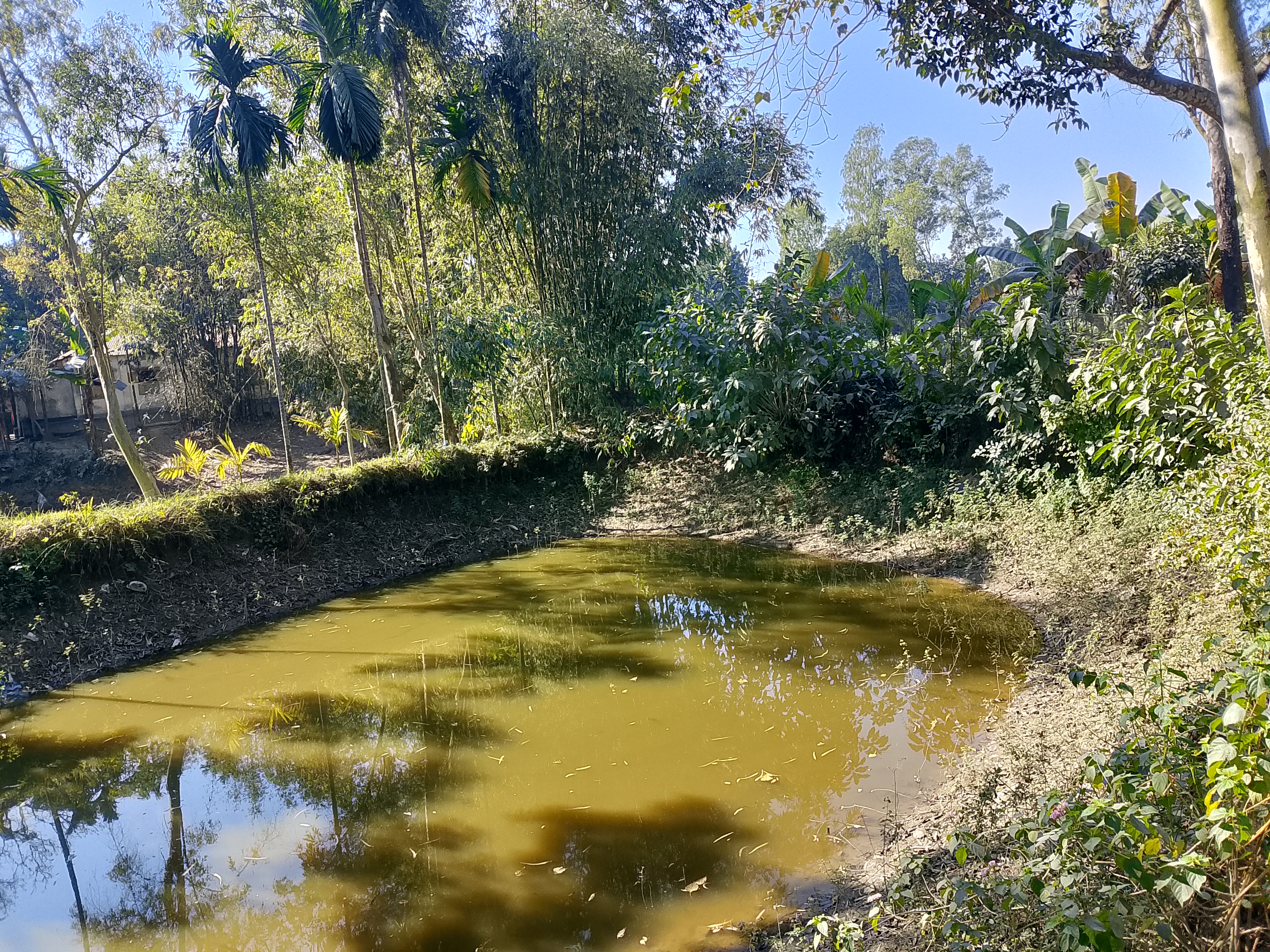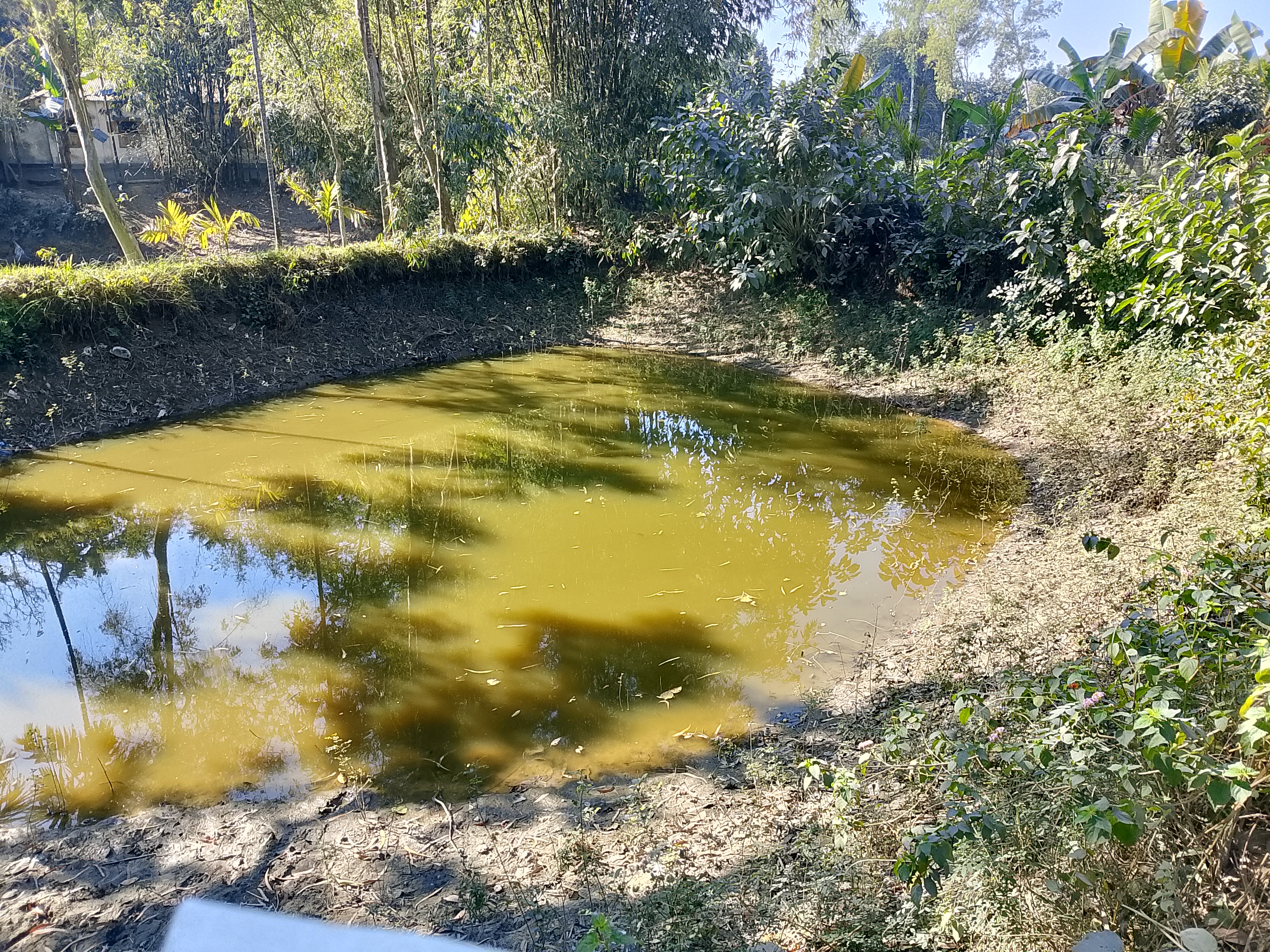 This pond is located beside our house, on the side of the road, which is why a large amount of fish is not farmed here—only a small number of fish are raised for home consumption. I went to the pond, and after going there I saw that the fish had been released nicely. It is easier to catch fish in shallow water, and they also taste quite good. The fish from this small pond are especially delicious.