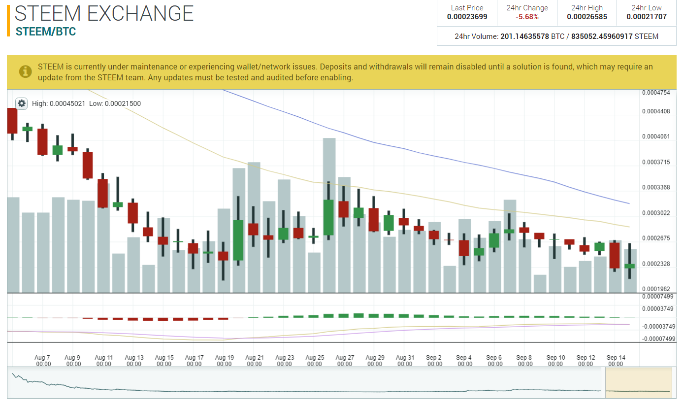 It should be noted though that there's little evidence of a Steem dump. Like most cryptos, Steem is primarily traded in pairs against BTC. The Steem/BTC chart on Bittrex is a complete non-event. People are fleeing Bitcoin. It would be nice if they fled into Steem, but alas it can't always go our way.