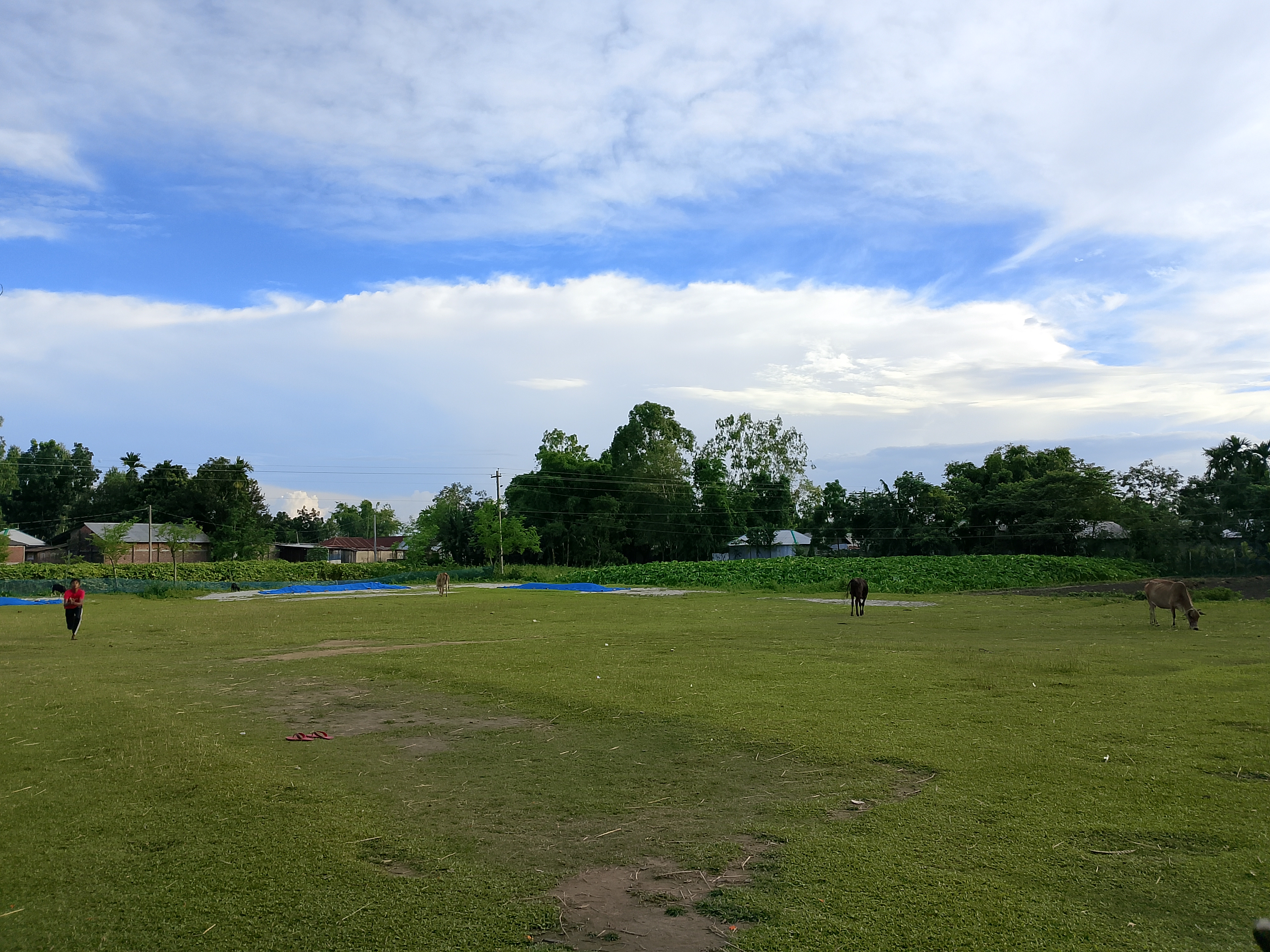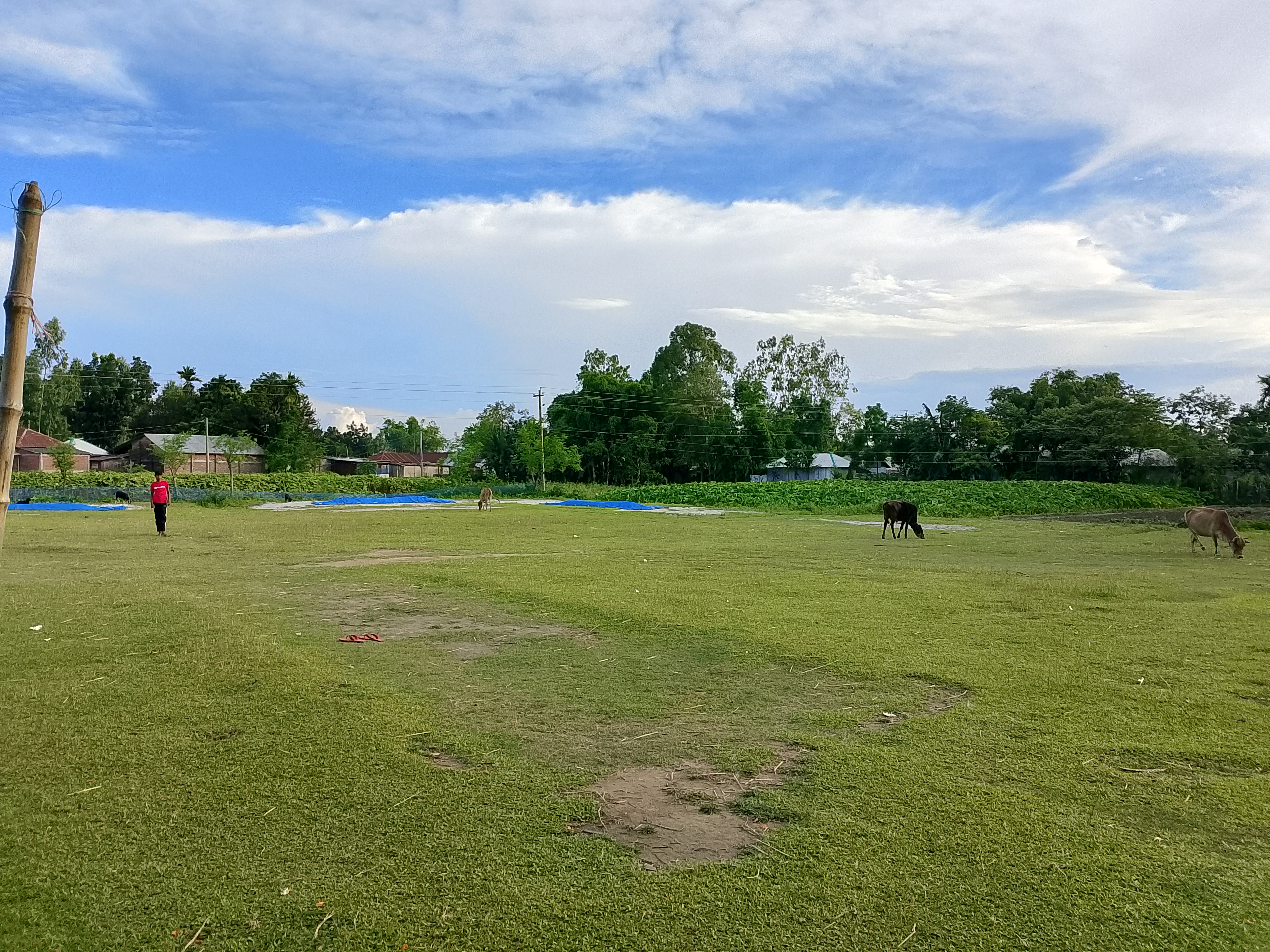 An open field lies vacant. On the ground, cows and goats were seen grazing, as there is plenty of grass growing from the soil. This is a school field. The school runs from morning until noon or afternoon, and after that, the field remains empty. Sometimes, players come and play there.