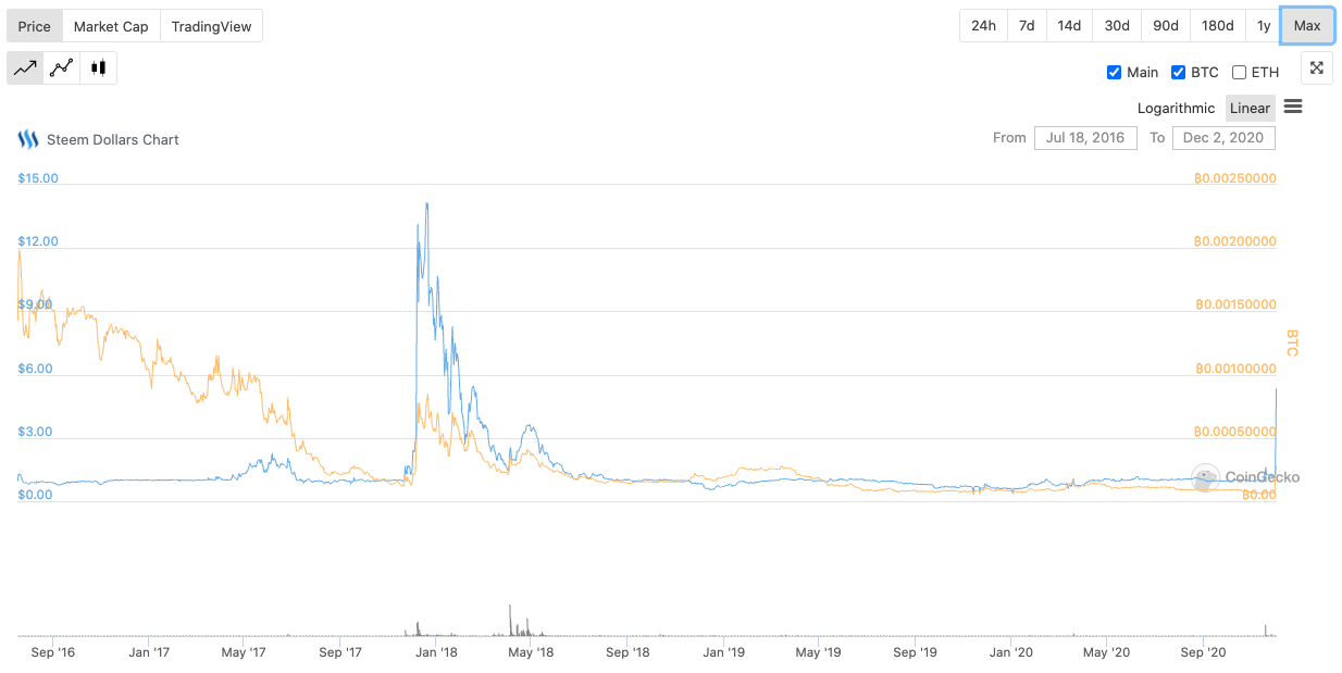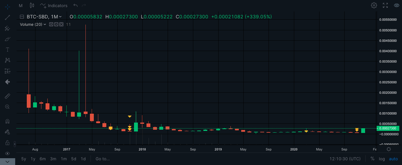 Reviewing the history of SBD, we can see easily enough it got to all time high in the last bull run of BTC and Alts back in end of 2017. More than 14 US Dollar at its peak (see last chart in this post). At the time of writing, SBD is something like 5 only.