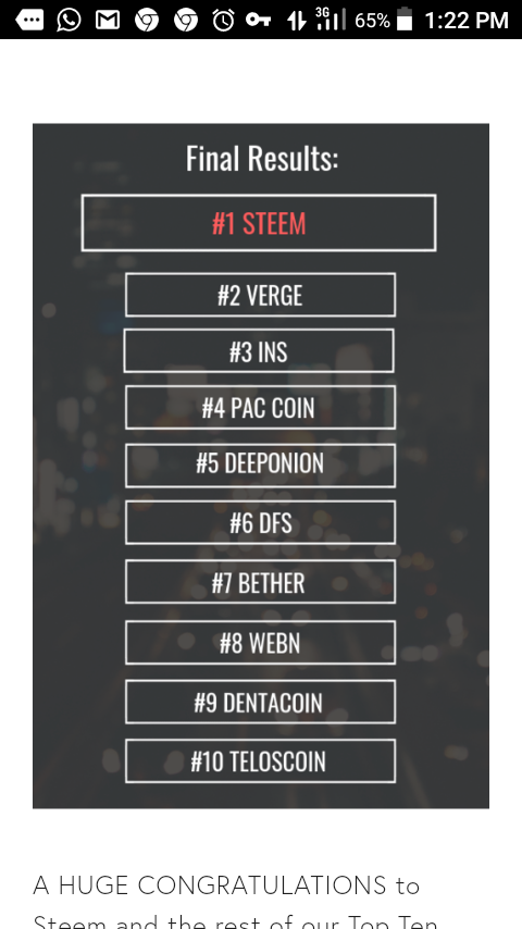 Earlier this month, steem was nominated among so many forms of cryptocurrency including verge, PAC, deep onion, DFS, better, WEBN, dentacoin, teloscoin to participate in the competition after which one place for free listing on netcoins worth 30000USD was to be given to the winner.