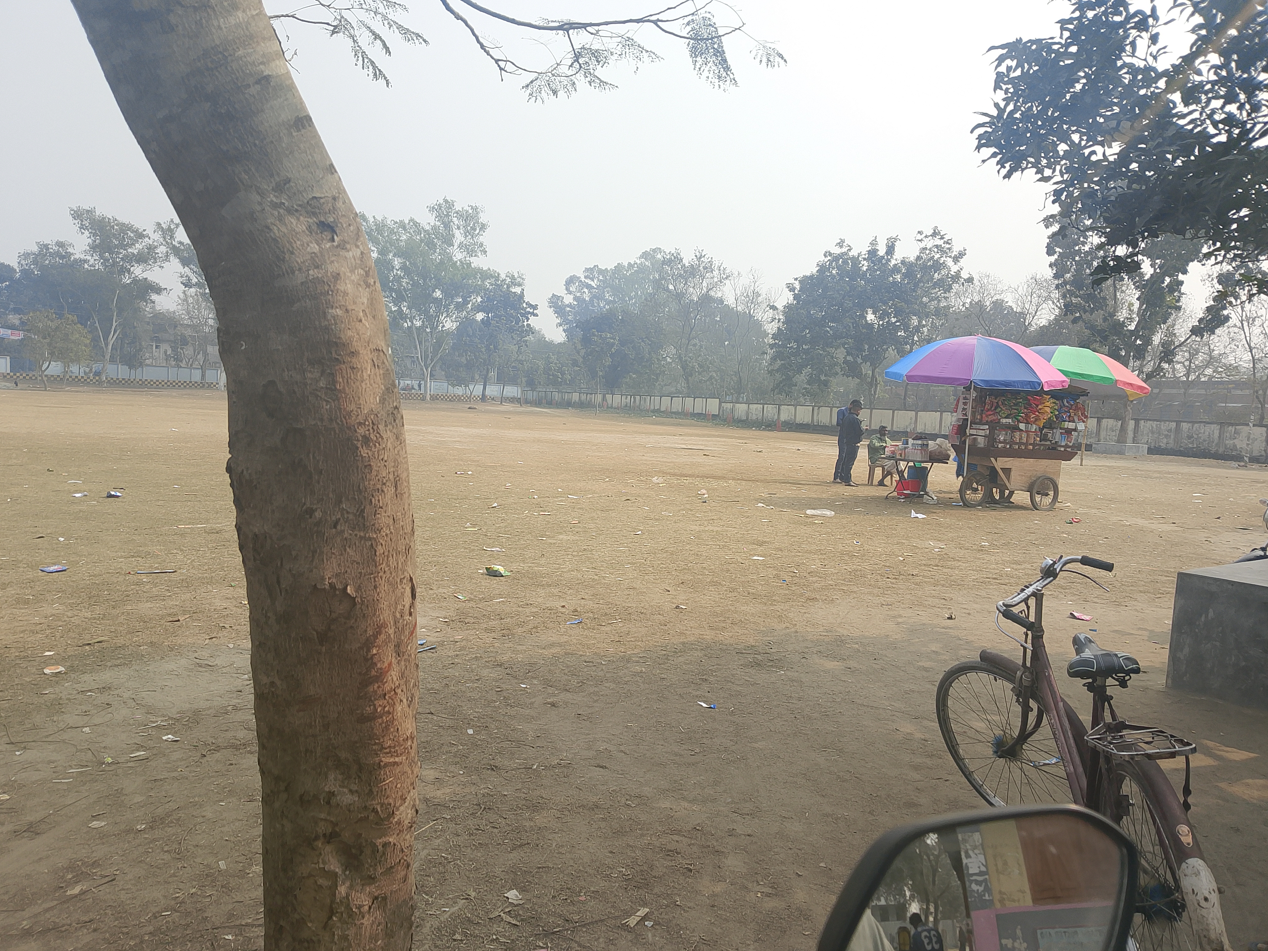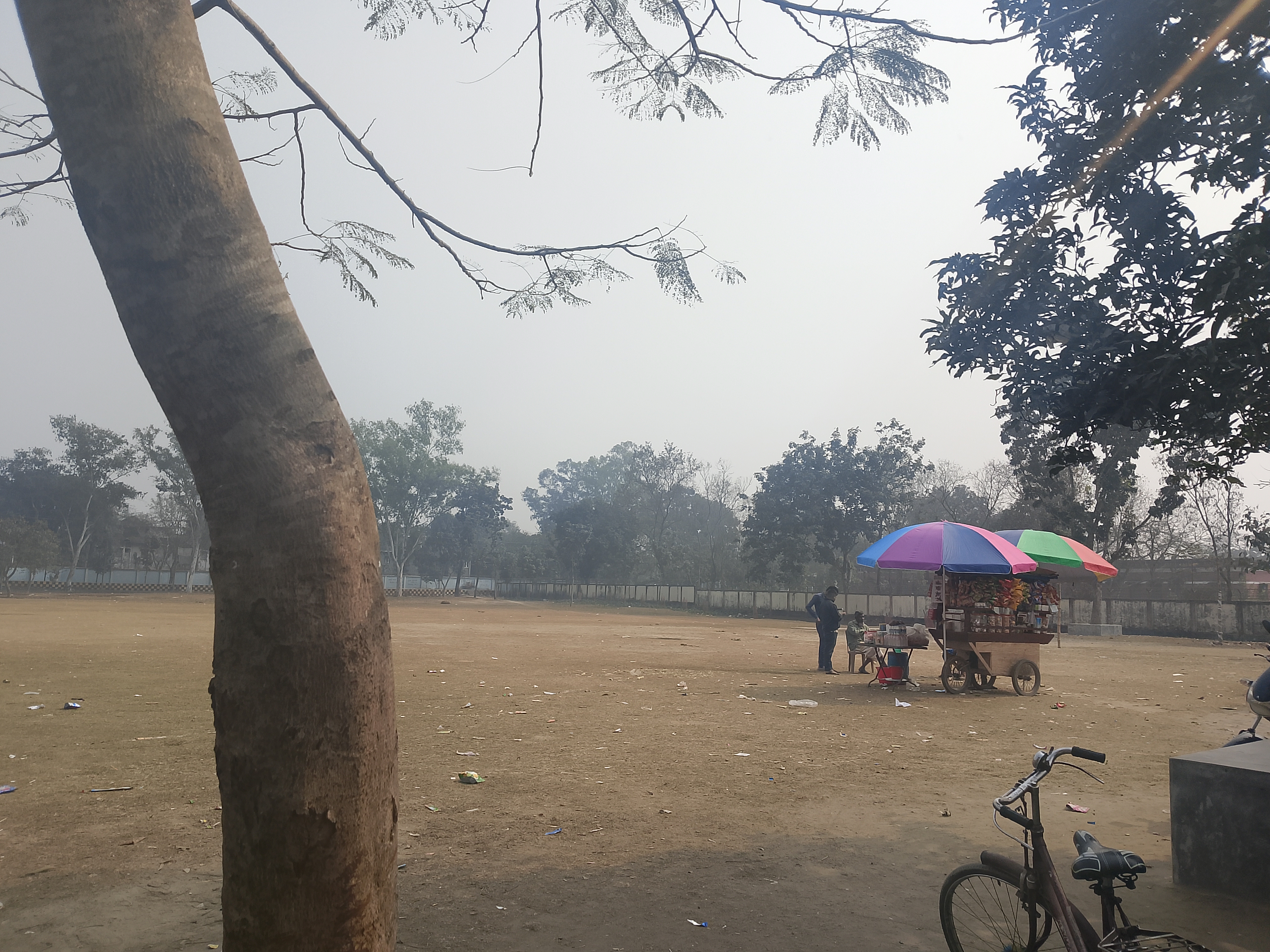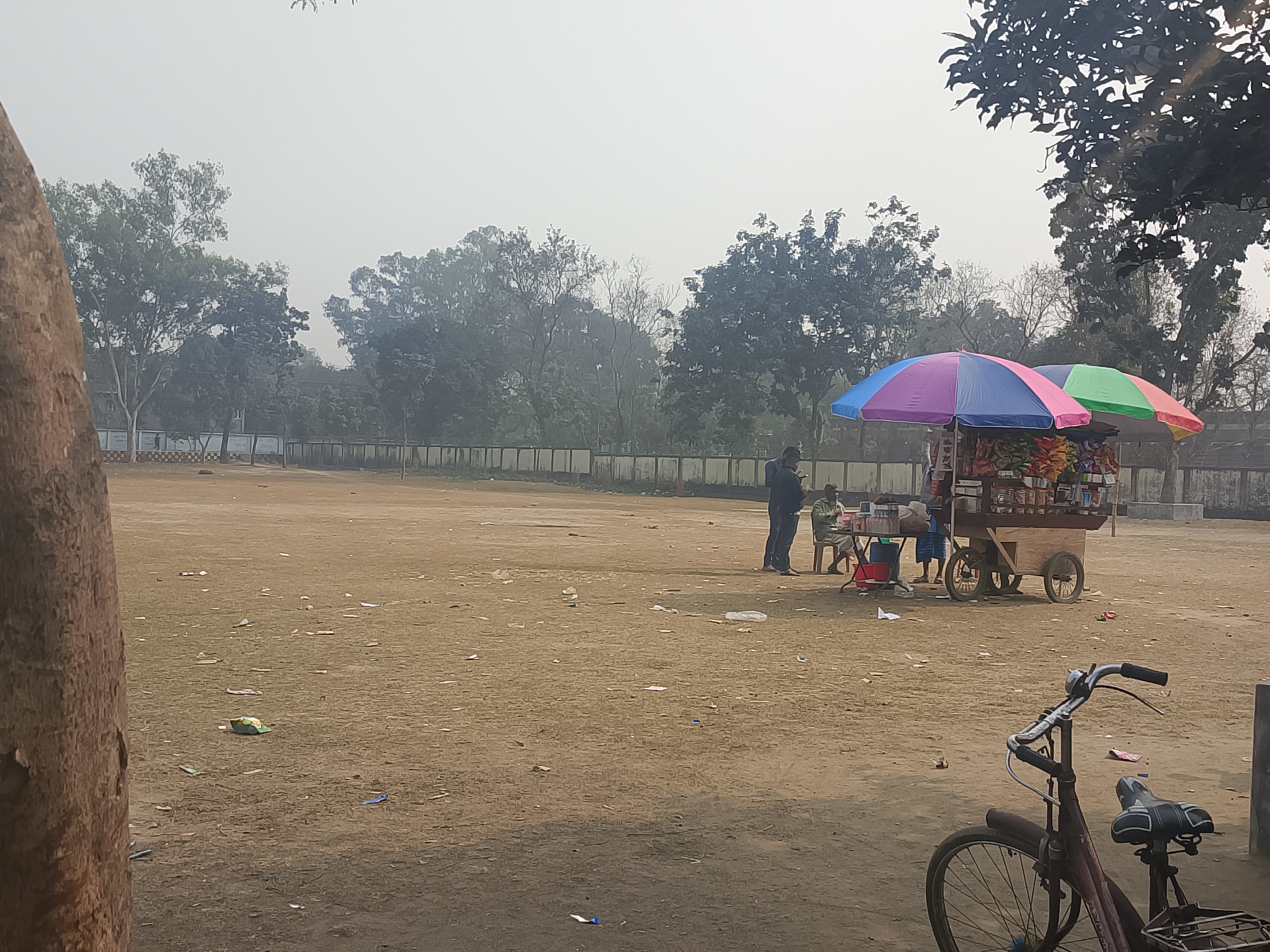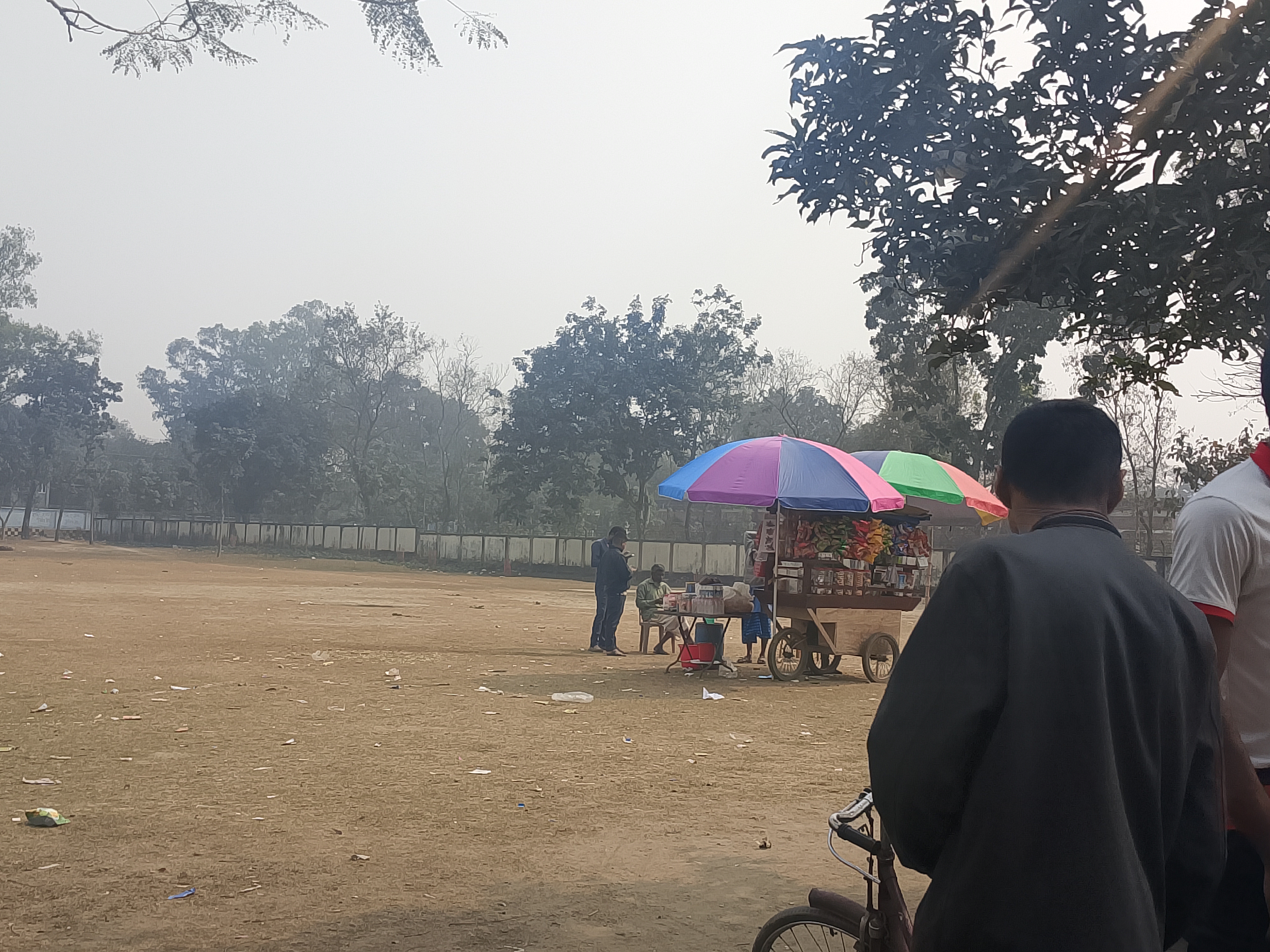 Boş bir tarlada, şemsiyelerle donatılmış iki dükkan kurulmuş. Bu boş tarlanın yanında bir okul var ve bu yüzden bu dükkanlar okulun yanına kurulmuş. Dükkanlarda çeşitli çikolatalar, baharatlı pirinç patlağı ve her türlü ürün satılıyor. Şemsiyeler, özellikle sıcaktan ve diğer dış etkenlerden korunmak için, yukarıdan hiçbir şey düşmemesi amacıyla yerleştirilmiş. Bu düzenleme çok güzel yapılmış. Ürünler şemsiyelerin altında güzelce düzenlenmiş. Bu düzenleme çok iyi sonuç vermiş ve bu sayede çocuklar yiyeceklerini ve atıştırmalıklarını buraya getiriyorlar. Dükkan iyi satış yapıyor. Bugün okul bahçesine gittim ve oradaki ortamı gördüm.