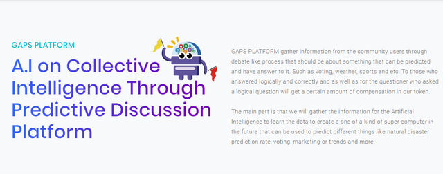GAPS PLATFORM gather information from the community users through debate like process that should be about something that can be predicted and have answer to it. Such as voting, weather, sports and etc. To those who answered logically and correctly and as well as for the questioner who asked a logical question will get a certain amount of compensation in our token.