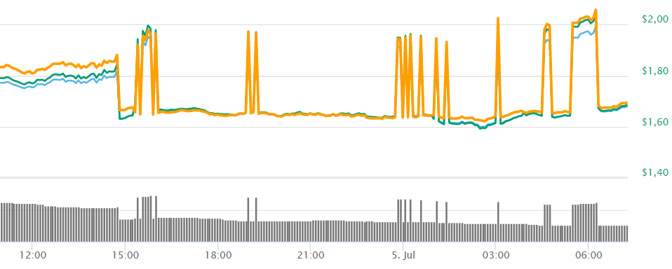 In the last few weeks. Steem has unfortunately not been doing so well ( Market wise). But as of Yesterday, something far more concerning is going on. We see the price of Steem jump from $1,60 to $2, to back to $1,60 and repeat ...