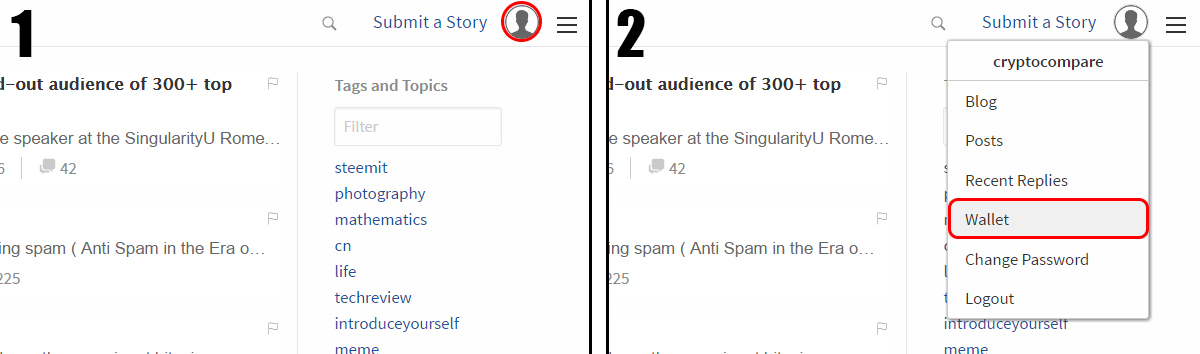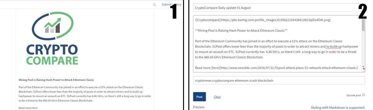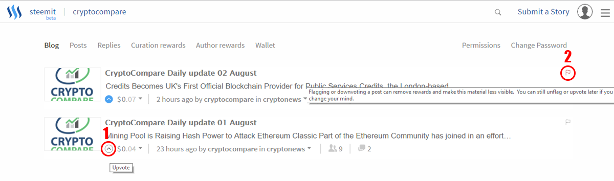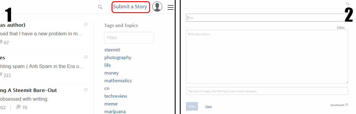 Step 3: Find a Story you like and upvote it by clicking the arrow (1). You can also downvote content by Flagging it (2).