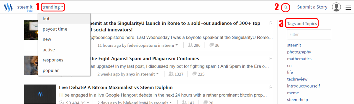 Step 2: Browse for Stories. You can use the search tool (1) or filter by statistics (2), tags and topics (3)