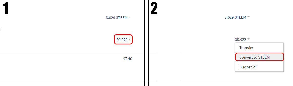 Step 2: Click the arrow next to your Steem Dollar balance and click "Convert to STEEM"
