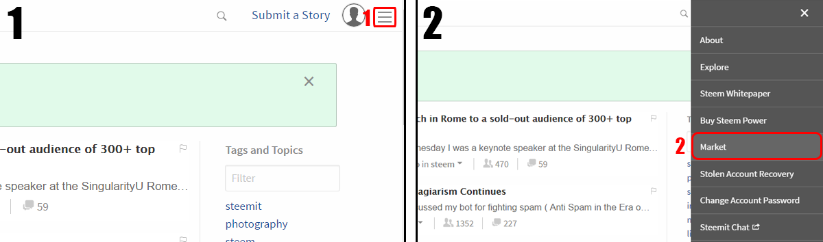 Step 1: Click the menu (1) and choose "Market" (2).