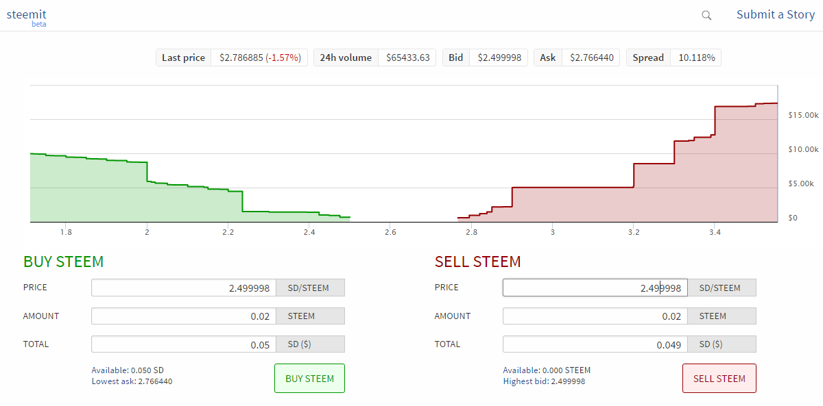 Step 2: You will be taken to Steemit's decentralized exchange. Fill in the price and ammount of steem/steem dollars you want to buy or sell.