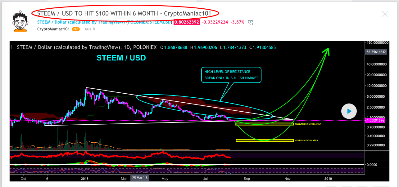 When you look at the previous rebounds Steem had, it will rebound and I'd say $10 is very possible, especially when we see how Ethereum when from $10 to $100 in no time.