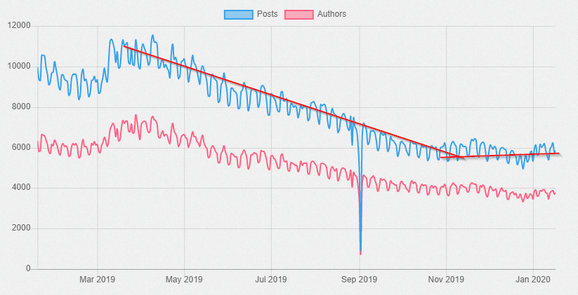 When looking at the evolution of the number of posts, we can again see a certain stabilisation, in the last weeks even a little regain of activity which I find encouraging.