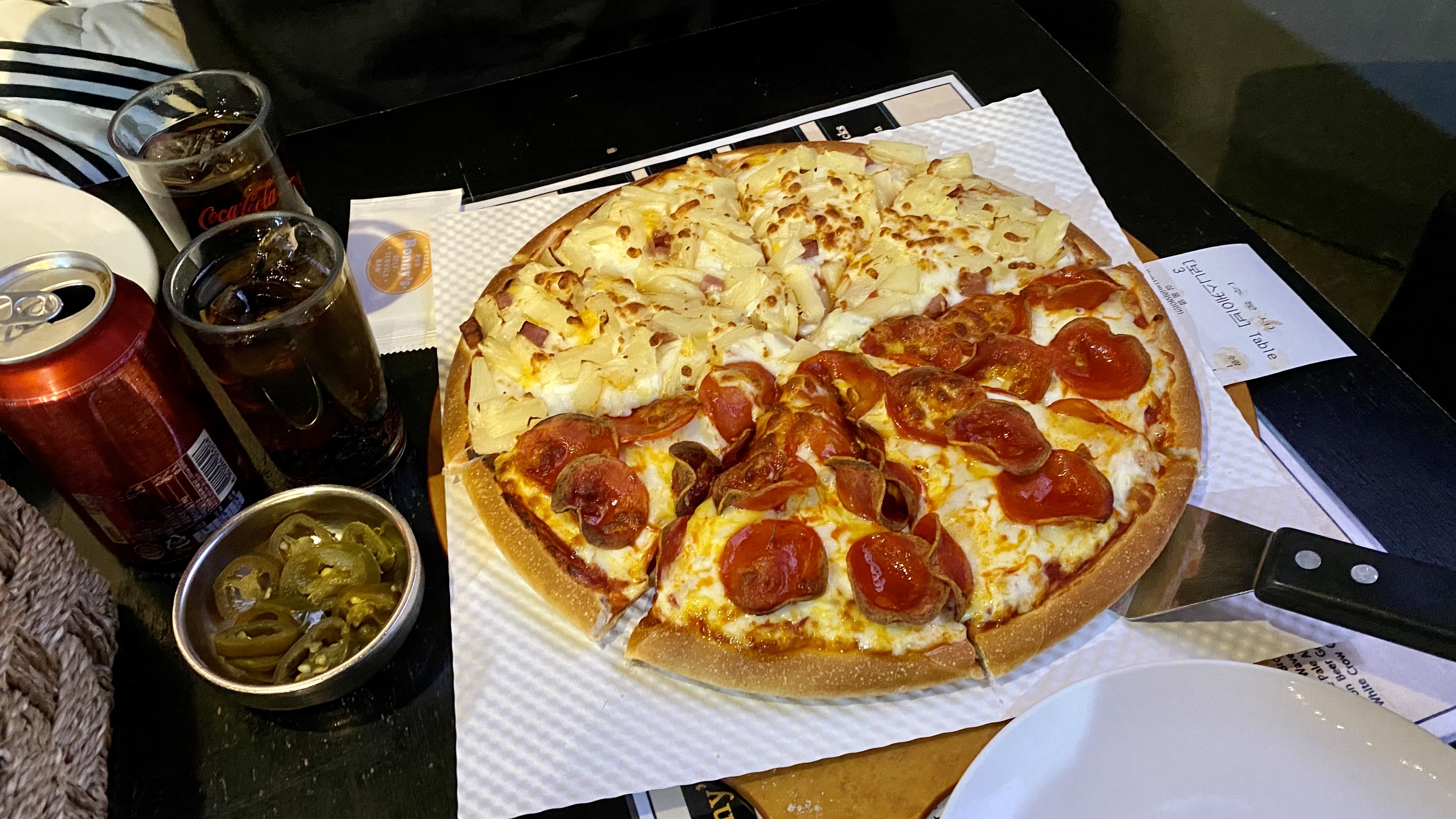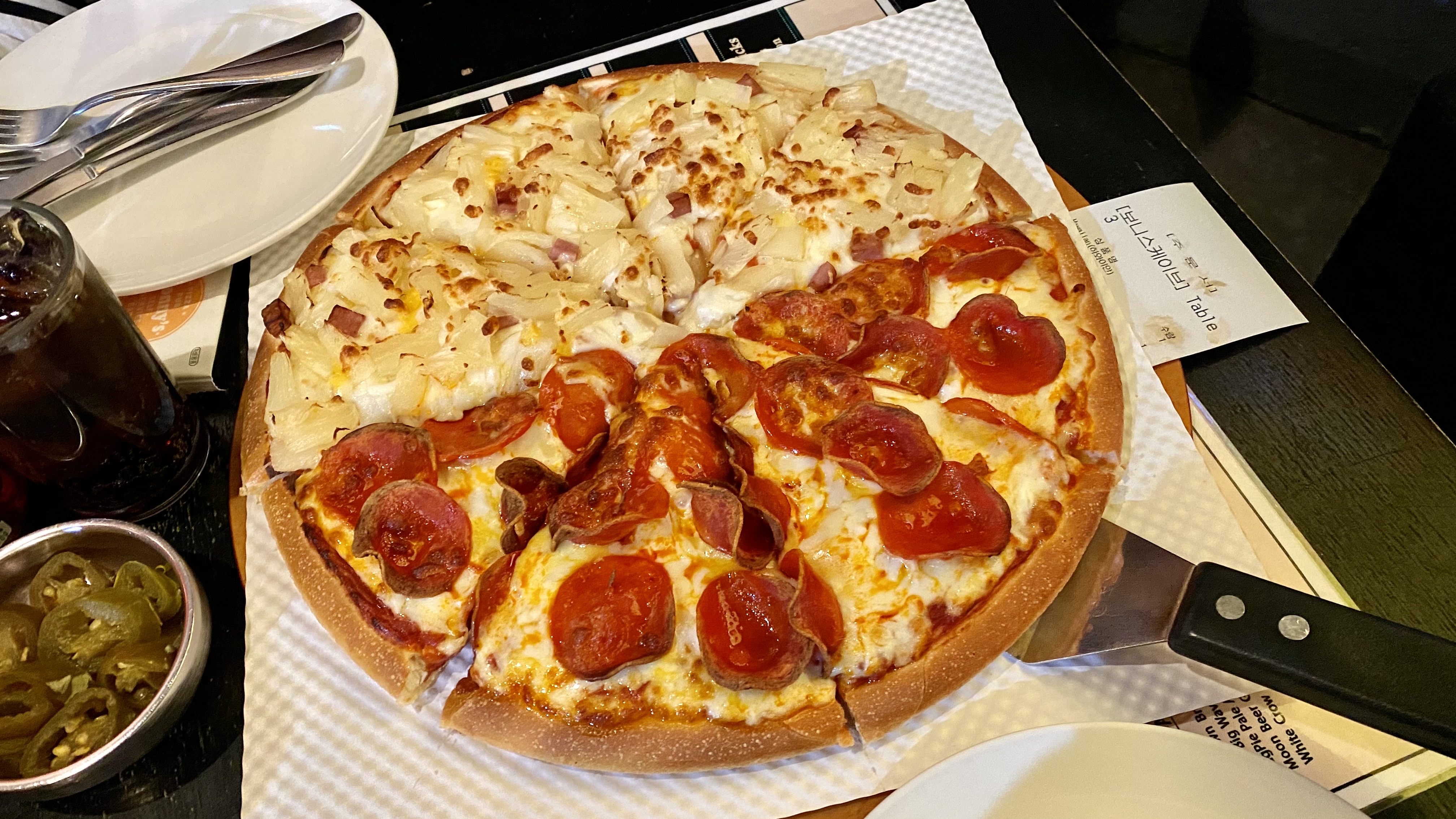 피자는 역시 반반으로 하프앤하프! 하와이안이랑 페퍼로니로 주문했어요~
