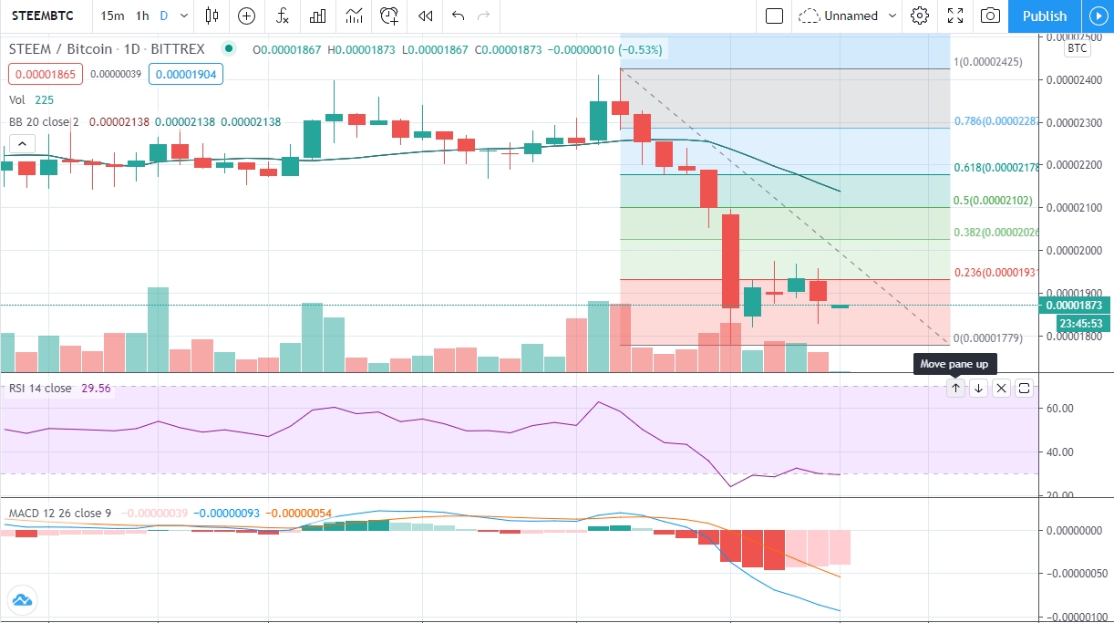 We are oversold on the RSI, Relative Strength Index, and the MACD looks to be finally tapering upwards somewhat. Unless there is another major Bitcoin move I would expect STEEM to consolidate at these levels and find a little bit of gains towards the beginning of next week. (RSI(相对强弱指数)相对我们超卖,MACD看起来最终会逐渐变小。除非比特币有其他重大变化,否则我预计STEEM将在这些水平上进行整合,并在下周初之前获得一点收益。)