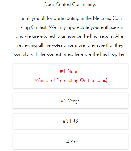 I checked on the website today and discovered that STEEM was the official winner of the Netcoins Coin Listing contest. STEEM has won a free listing on Netcoins!