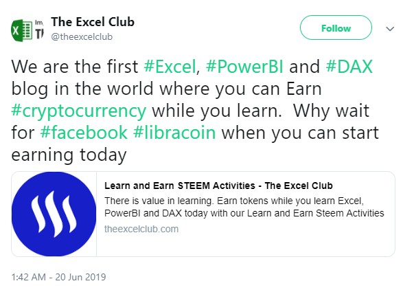 Esta semana, en lugar de una nueva publicación, tienes la oportunidad de ponerte al día con algo de aprender y ganar actividades y ganarte algunos tokens STEEM. Estos tokens actualmente están valuados en más de $ 0.40 y pueden intercambiarse fácilmente por efectivo, Bitcoin y otras Criptomonedas. Con Facebook lanzando su propia moneda pronto, estoy seguro de que no pasará mucho tiempo antes de que puedas cambiar las monedas de Facebook por Steem y Steem por las monedas de Facebook. Tienes la oportunidad de adelantarte al juego con solo aprender Excel