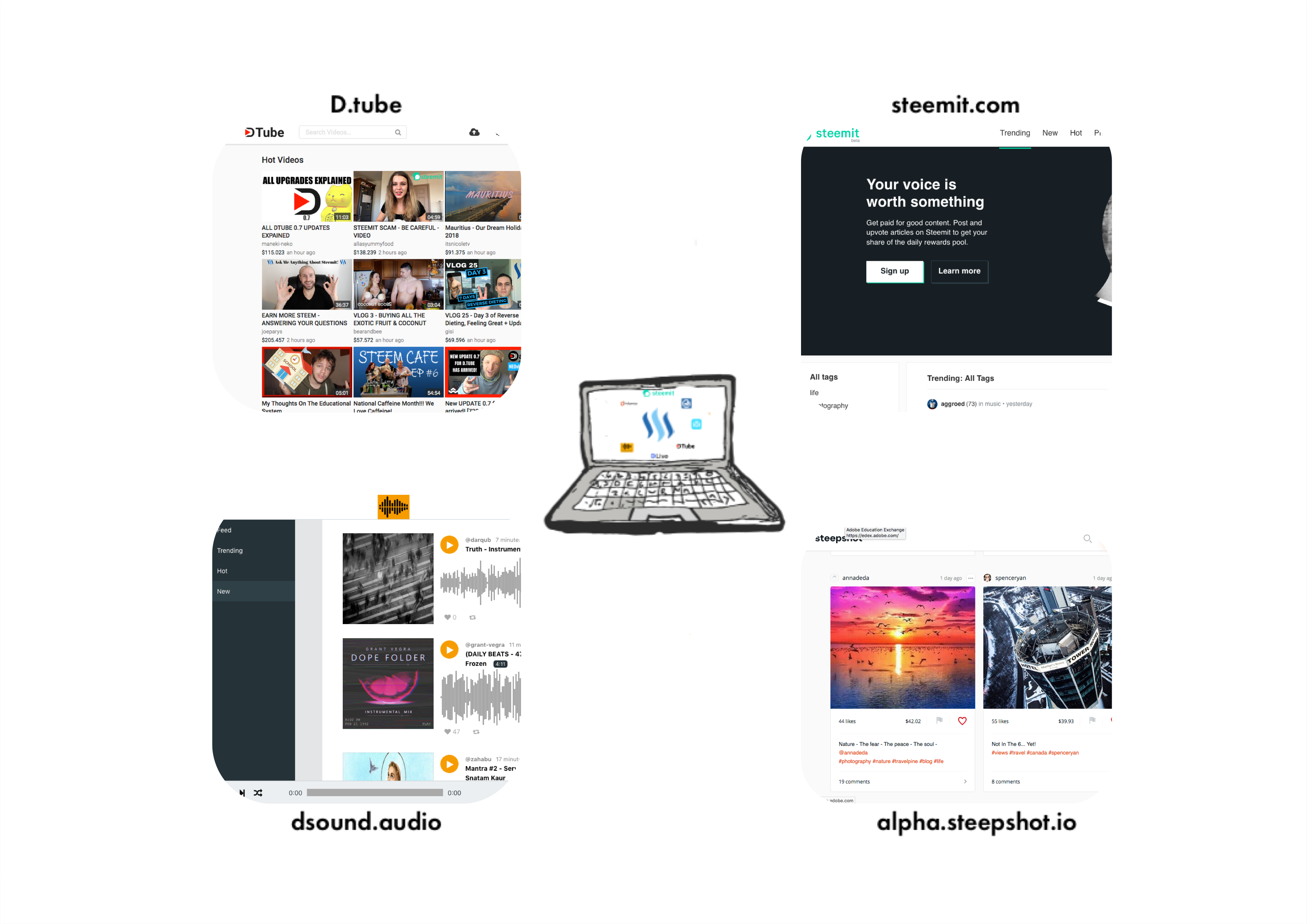 So, sites like Steemit, Dtube, dsound, steepshot, which are just some of the many growing applications being being built on STEEM, allow you to experience and interface with the blockchain in different ways.source @designeffort