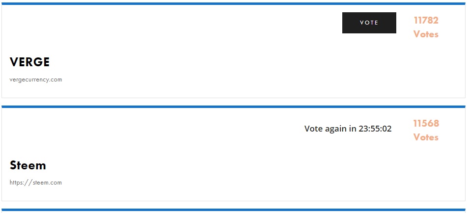 At the time of writing, STEEM is in second place with 11589 votes. It trails VERGE by roughly 200 votes.