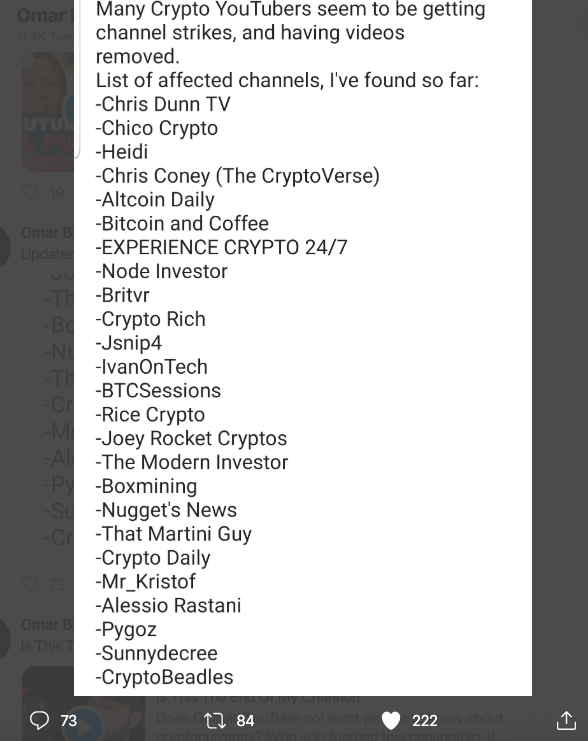 “It seems that a reason why YouTube would have to go after crypto channels is any links to external websites/exchanges in video descriptions.”