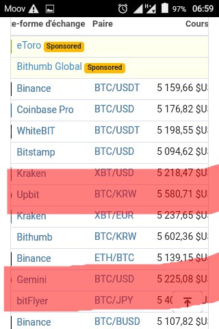 the price of BITCOIN has dropped and it is now at approximately US$5139. The lowest price for which bitcoin is traded is US$4999 on the Stex exchange with the BTC/USDT exchange pair. This is good news for traders as at this price you can realize a lot of profit. For example take the Stex ,Exmo ,Probit ,Btcbox and Livecoin exchanges.On Stex the price of Bitcoin is US$4999 with the BTC/USDT exchange pair, the bitcoin is redeemable against the RUB at US$5912 on Exmo, the bitcoin is redeemable against the USD at US$5875 on Livecoin .... so if you buy 1 bitcoin with USDT on Stex then you send it to Livecoin and resell it against the USD you will have realized more than $800 in profit.So take advantage of this deflation of the bitcoin price to realize a maximum profit I wish you good luck and especially do not miss this opportunity. NB:All the prices we display here come from COINGECKO and these prices could change.We advise you to consult the current prices on Coingecko to know on which site you can make a profit and before you start trading.