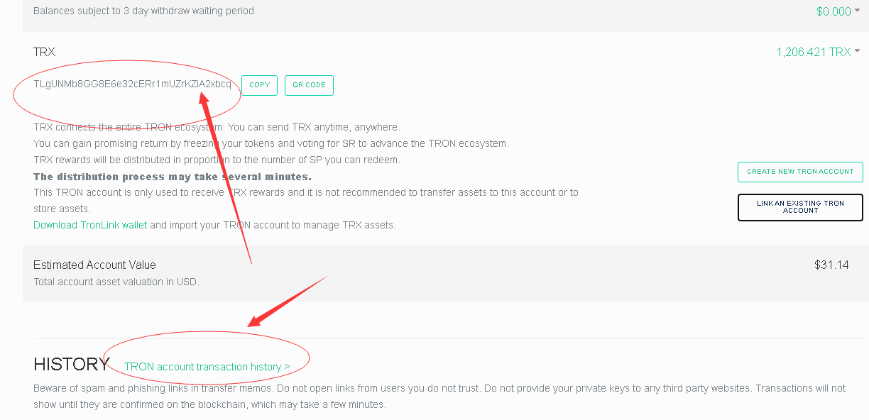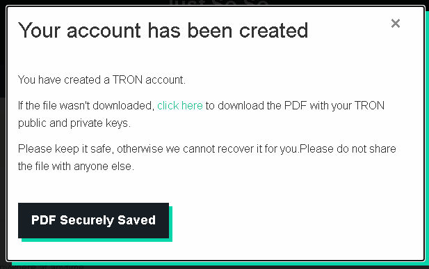 Proceed, you will have a TRON wallet created, and then you would need to safe a PDF which contains TRON public key and private key.