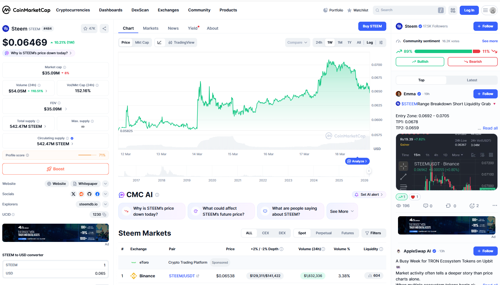 STEEM is down $0.06467 (2026-03-18)