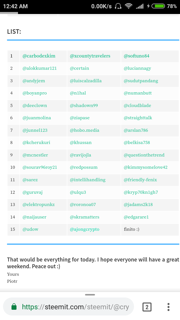 This list contains people who are now in my auto upvote list, everyone in this list will get 2 upvotes per day at 100% on posts made each 24 hours upvotes will be made after 30 mins from post age. Courtesy of @khussan