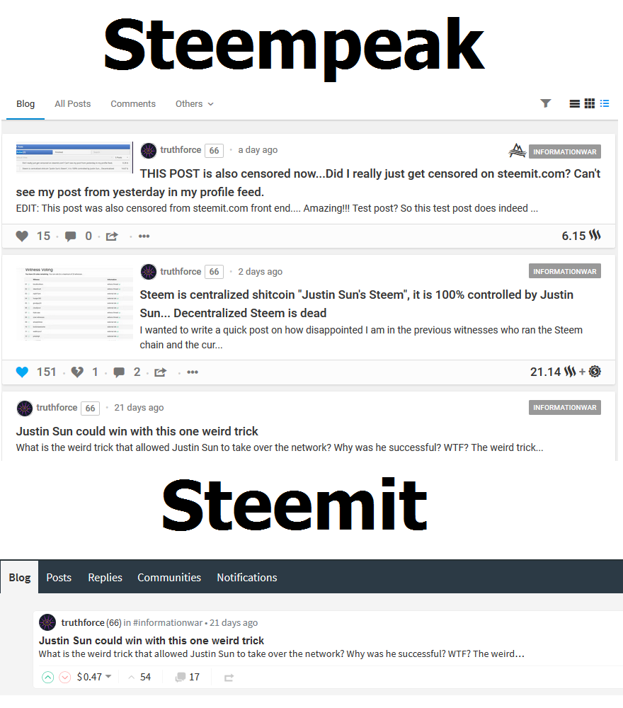 Steemit.com has taken to censoring all posts that speak ill of Supreme Leader Justin, talk about his fraudulent & criminal activities, or even that are simply promoting our community's move to a new, more decentralized platform. As one example, look at @Truthforce's front page on Steemit vs Steempeak.