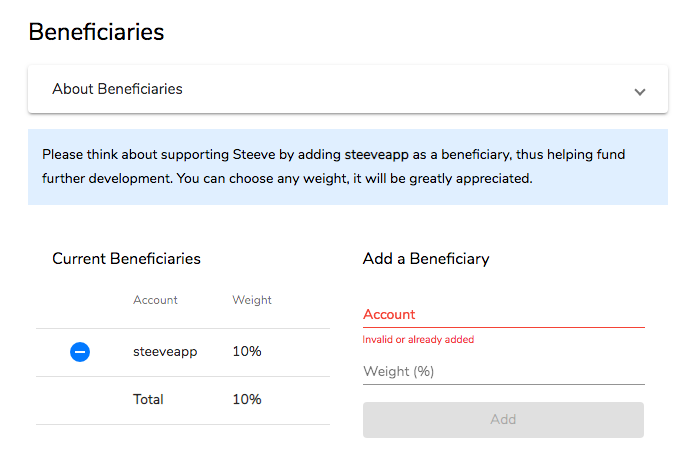 In case you are using Steeve regularly already, and we are hoping so, or just want to support the project, think about setting @steeveapp as a beneficiary in your account settings to help fund further development. We are not asking for much, any share will do.