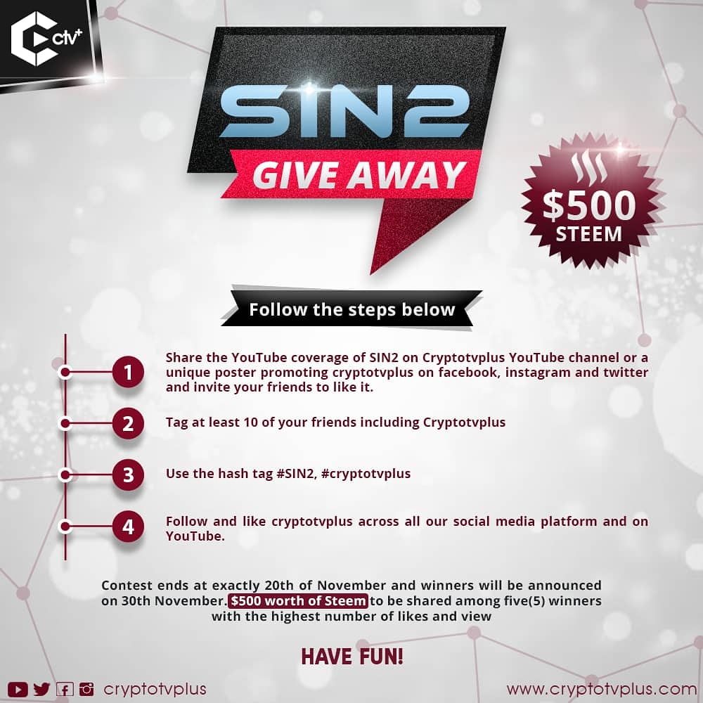 SIN2 Giveawaykidosh (35)in #steem • 7 years ago Steem in Nigeria 2 (SIN2) is giving out $500 worth of steem to people willing to participate in this contest. Follow the steps on the flyer to stand a chance to win. #blockchain #cryptocurrency #giveaway