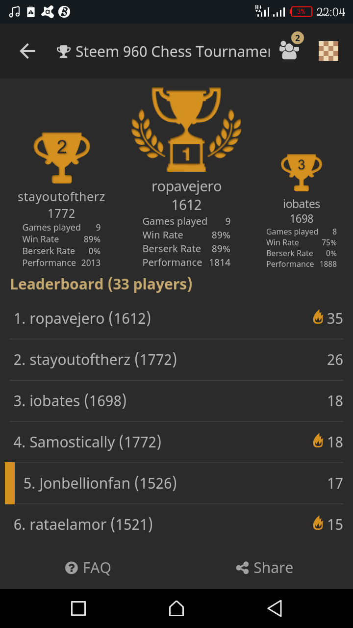 Today couldn't have gotten better without playing @schamangerbert steem tournament. It wasn't surprising that today's edition was chess960. Happy to participate in this recent edition. Although I finished 5th in the competition but can't wait to break the bad luck and win steem blitz, maybe next edition and congratulations to the winners, am proud that you guys were able to understand that kind of chess and still win.