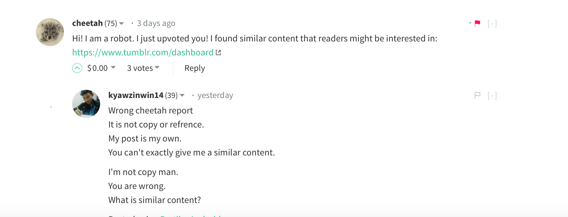 cheetah ကို က်ေနာ္ flag ေပးခဲ႔လိုက္တယ္ ဒီေကာင္ အီေယာင္ဝါးဗ် သူ ေန႕တိုင္း report post ေရးတင္ခ်င္တာနဲ႕ သူမ်ားေတြကို ေသာက လိုက္ေပးေနတာ 😊👍