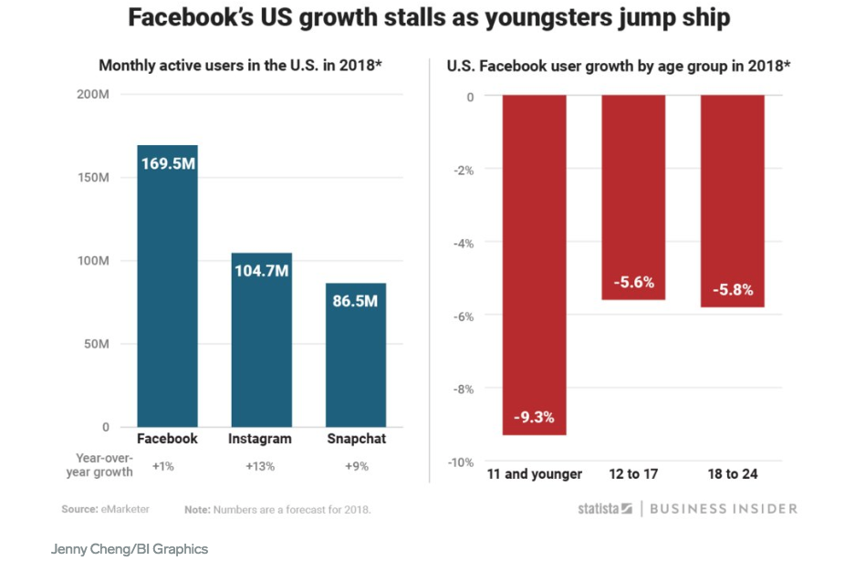 Twitter and Facebook have been experiencing declines in user growth. In particular, Facebook is losing young people at an alarming rate. According to an article published by Insider Business, Facebook has experienced a -20.7% decline in users between ages 11 - 24 years old. Facebook has lost its appeal to young people and the platform’s reputation is only getting worst. The only saving grace for Facebook is Instagram which has seen exponential growth since its launch, from 1 million users during the first two months on the market to 800 million users by September 2017. In 2012 Instagram was acquired by Facebook an estimated $1 billion.