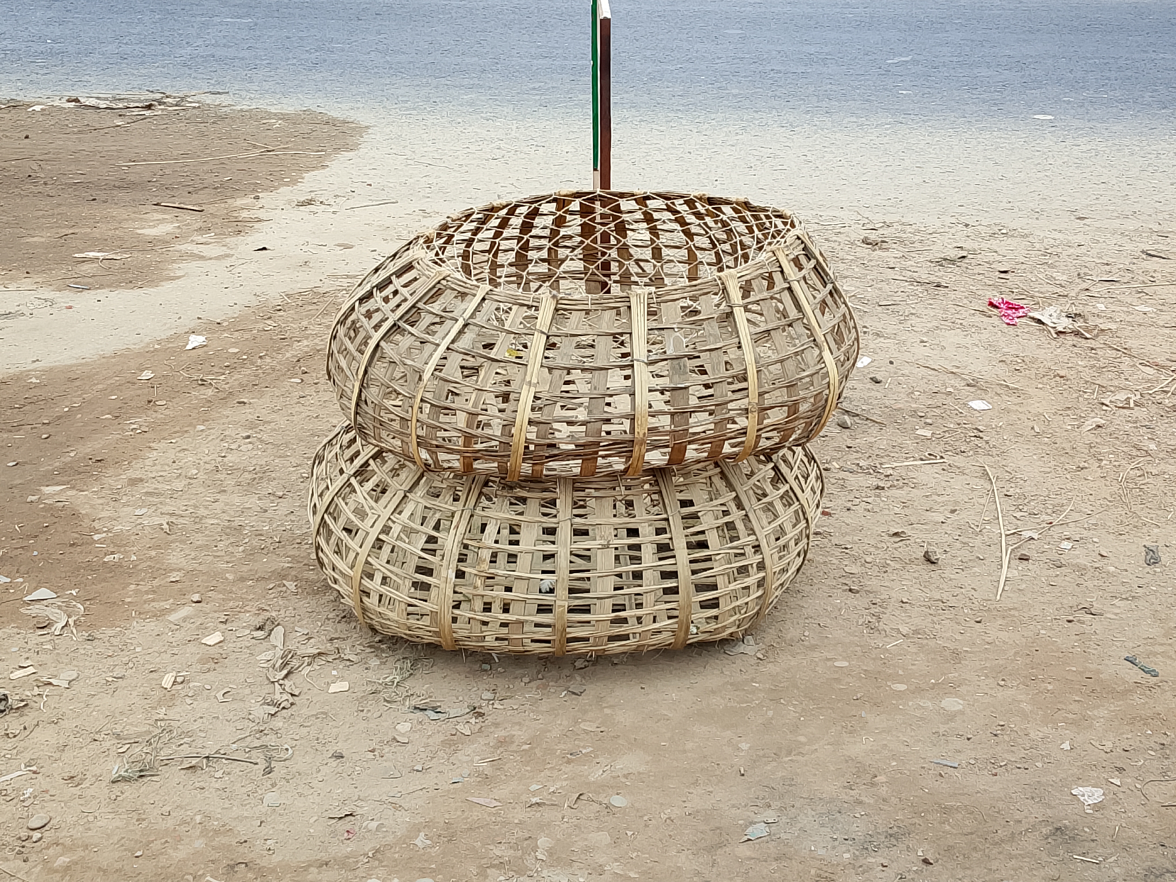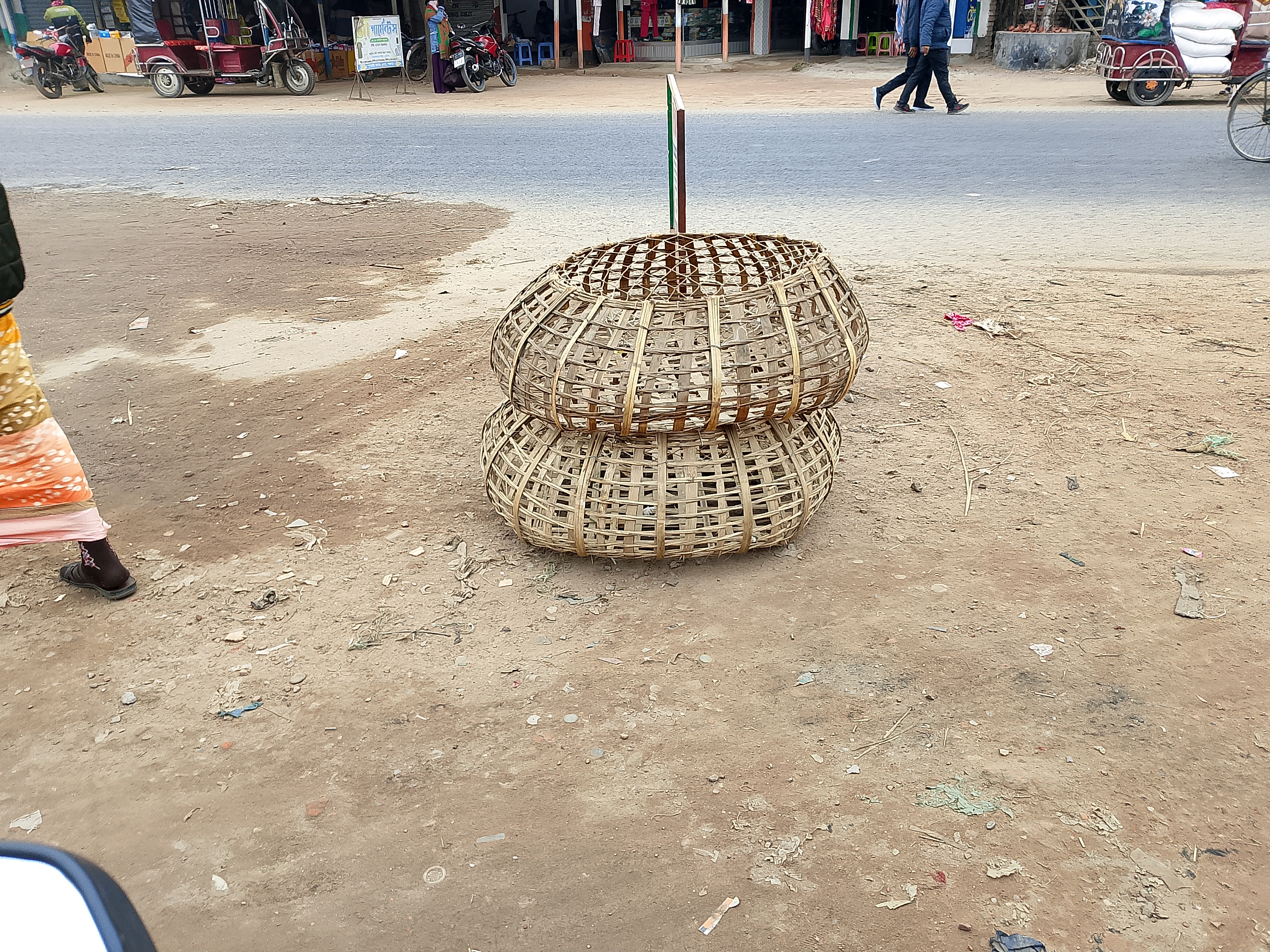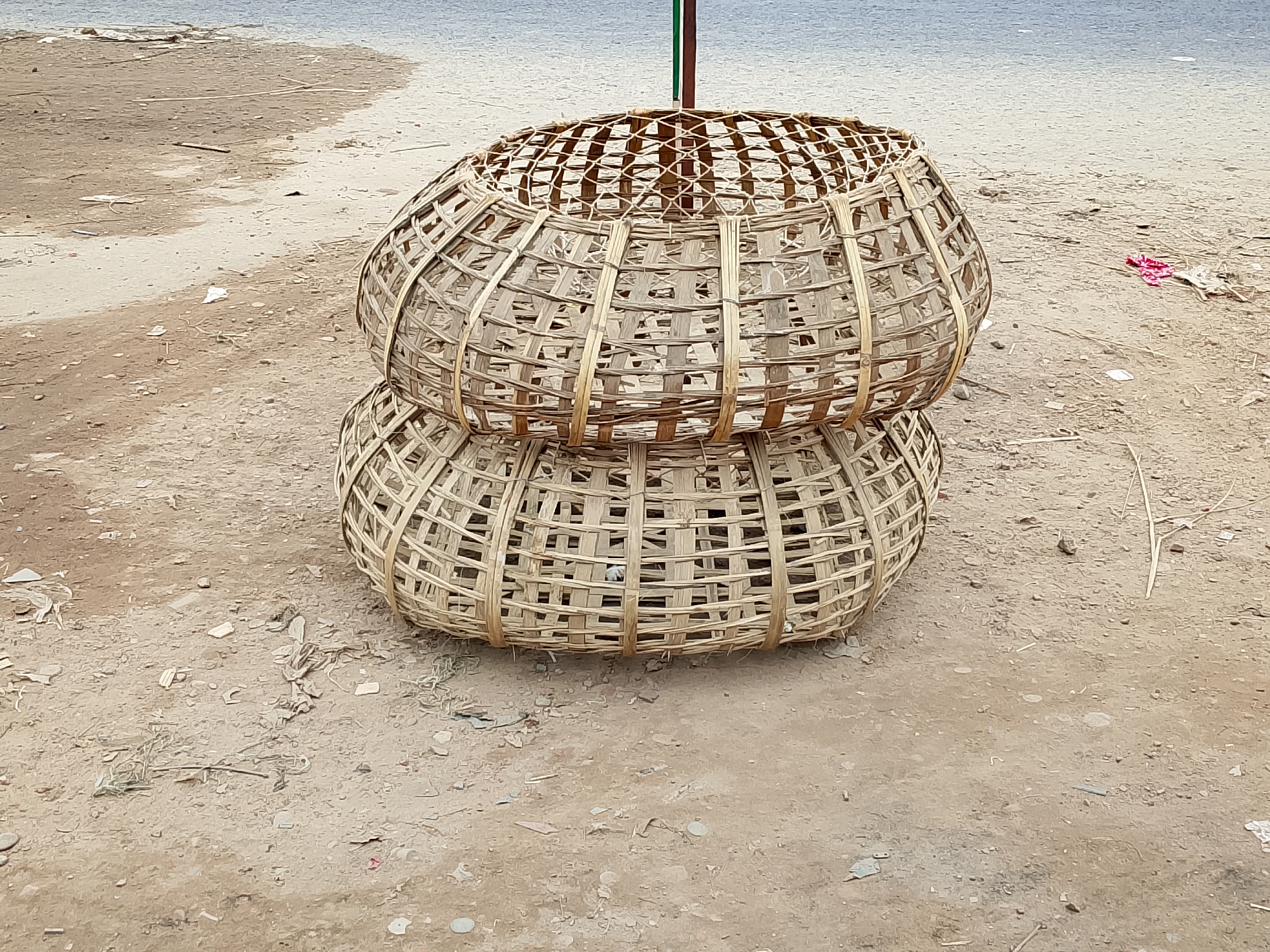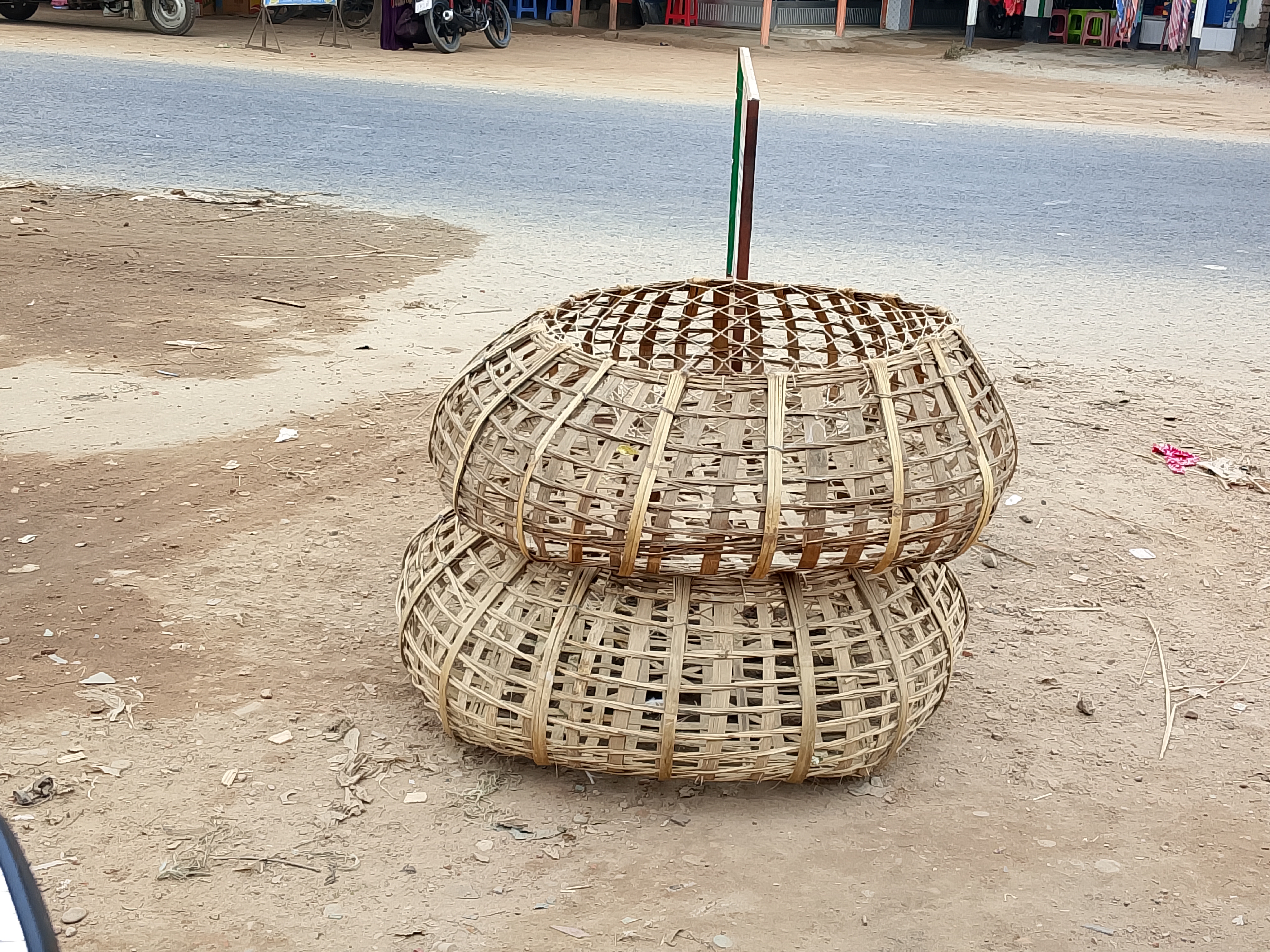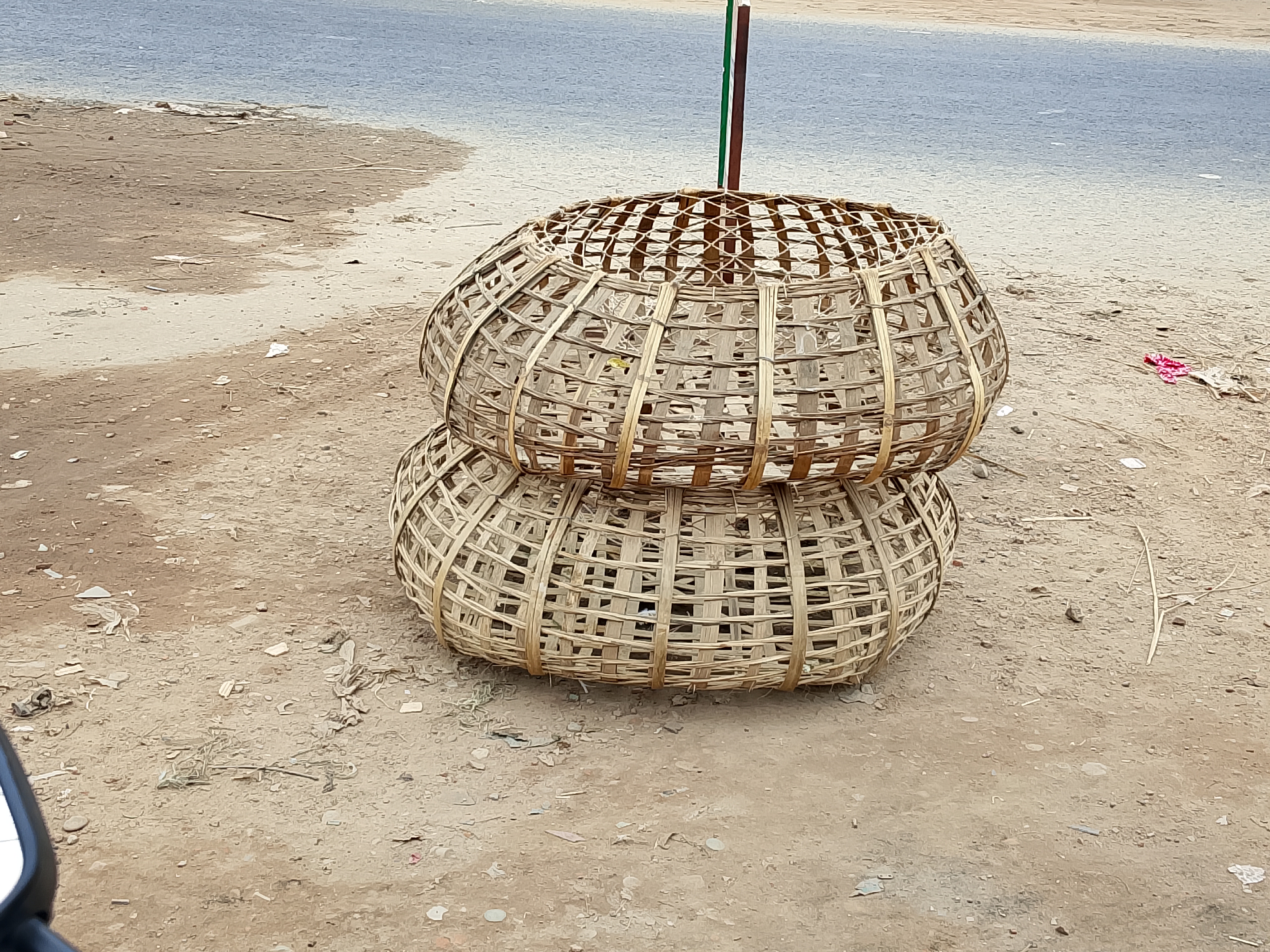 These cages have been made to take chickens to the market for sale. The cages are mainly made of bamboo, cut thin and crafted very neatly. They are very convenient for transporting ducks and chickens, which is why they are used. Many birds can fit into these cages, but for larger birds, the cages need to be made thicker.